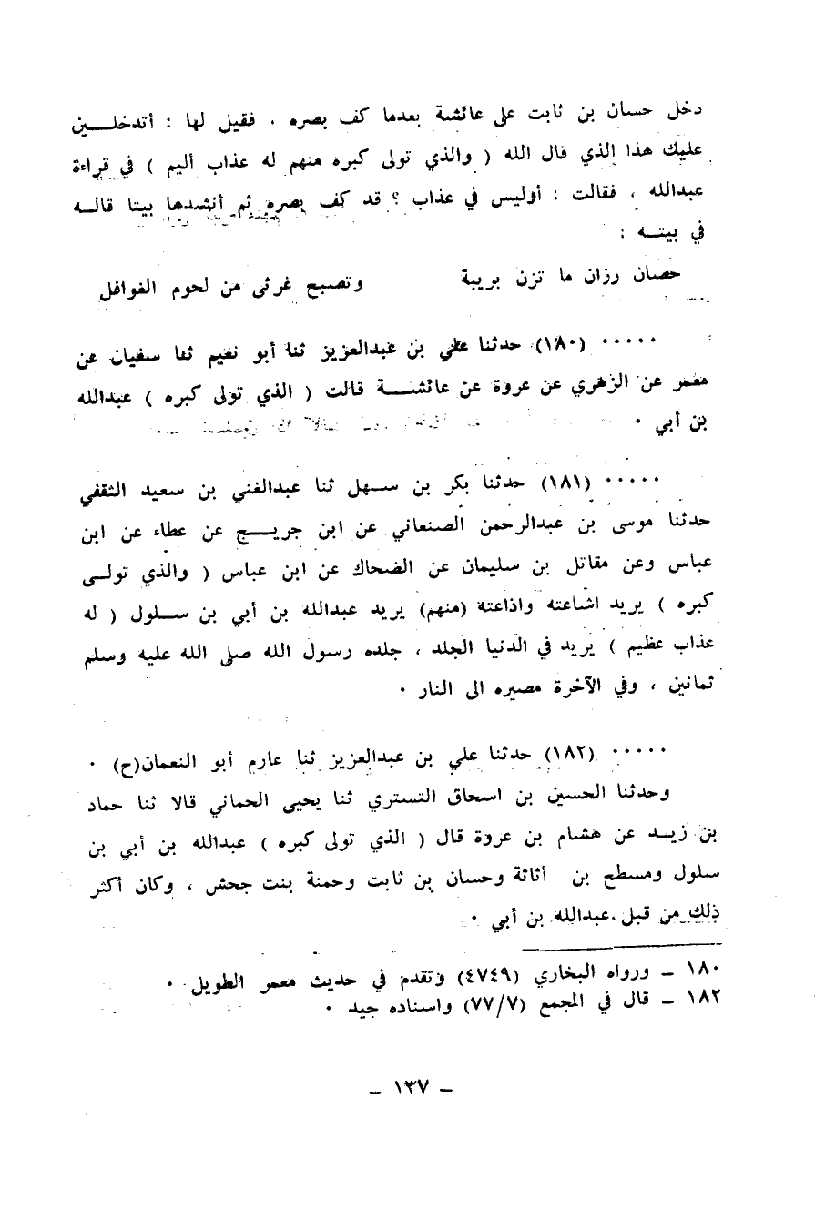 182 - حَدَّثَنَا عَلِيُّ بْنُ عَبْدِ الْعَزِيزِ، ثنا عَارِمٌ أَبُو النُّعْمَانِ، ح وَحَدَّثَنَا الْحُسَيْنُ بْنُ إِسْحَاقَ التُّسْتَرِيُّ، ثنا يَحْيَى الْحِمَّانِيُّ، قَالَا: ثنا حَمَّادُ بْنُ زَيْدٍ، عَنْ هِشَامِ بْنِ عُرْوَةَ، قَالَ: " {§الَّذِي تَوَلَّى كِبْرَهُ} [النور: 11] عَبْدُ اللهِ بْنُ أُبَيٍّ ابْنُ سَلُولَ، وَمِسْطَحُ بْنُ أُثَاثَةَ، وَحَسَّانُ بْنُ ثَابِتٍ، وَحَمْنَةُ بِنْتُ جَحْشٍ، وَكَانَ أَكْثَرُ ذَلِكَ مِنْ قِبَلِ عَبْدِ اللهِ بْنِ أُبَيٍّ "