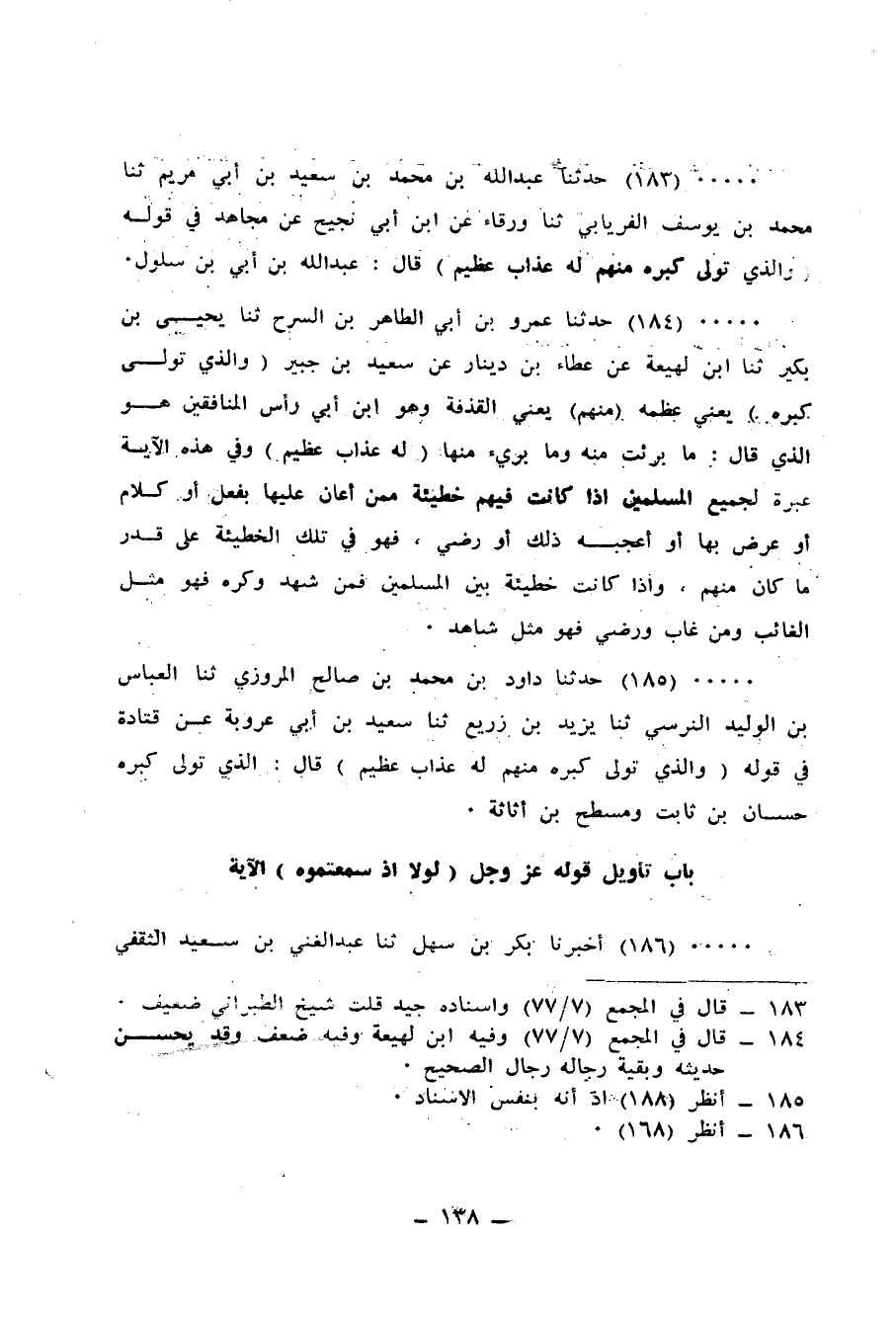 184 - حَدَّثَنَا عَمْرُو بْنُ أَبِي الطَّاهِرِ بْنِ السَّرْحِ، ثنا يَحْيَى بْنُ بُكَيْرٍ، ثنا ابْنُ لَهِيعَةَ، عَنْ عَطَاءِ بْنِ دِينَارٍ، عَنْ سَعِيدِ بْنِ جُبَيْرٍ: {وَالَّذِي تَوَلَّى كِبْرَهُ} [النور: 11] ، يَعْنِي: «عِظَمَهُ» ، {مِنْهُمْ} [النور: 11] يَعْنِي: " الْقَذَفَةَ وَهُوَ ابْنُ أُبَيٍّ رَأْسُ الْمُنَافِقِينَ هُوَ الَّذِي قَالَ: «مَا بَرِئَتْ مِنْهُ وَمَا بَرِئَ مِنْهَا» ، {لَهُ عَذَابٌ عَظِيمٌ} [النور: 11] «وَفِي هَذِهِ الْآيَةِ §عِبْرَةٌ لِجَمِيعِ الْمُسْلِمِينَ إِذَا كَانتَ فِيهِمْ خَطِيئَةٌ مِمَّنْ أَعَانَ عَلَيْهَا بِفِعْلٍ أَوْ كَلَامٍ أَوْ عَرَّضَ بِهَا أَوْ أَعْجَبَهُ ذَلِكَ أَوْ رَضِيَ، فَهُوَ فِي تِلْكَ الْخَطِيئَةِ على قَدْرَ مَا كَانَ مِنْهُمْ، وَإِذَا كَانَتْ خَطِيئَةٌ بَيْنَ الْمُسْلِمِينَ فَمَنْ شَهِدَ وَكَرِهَ فَهُوَ مِثْلُ الْغَائِبِ، وَمَنْ غَابَ وَرَضِيَ فَهُوَ مِثْلُ الشَّاهِدِ»