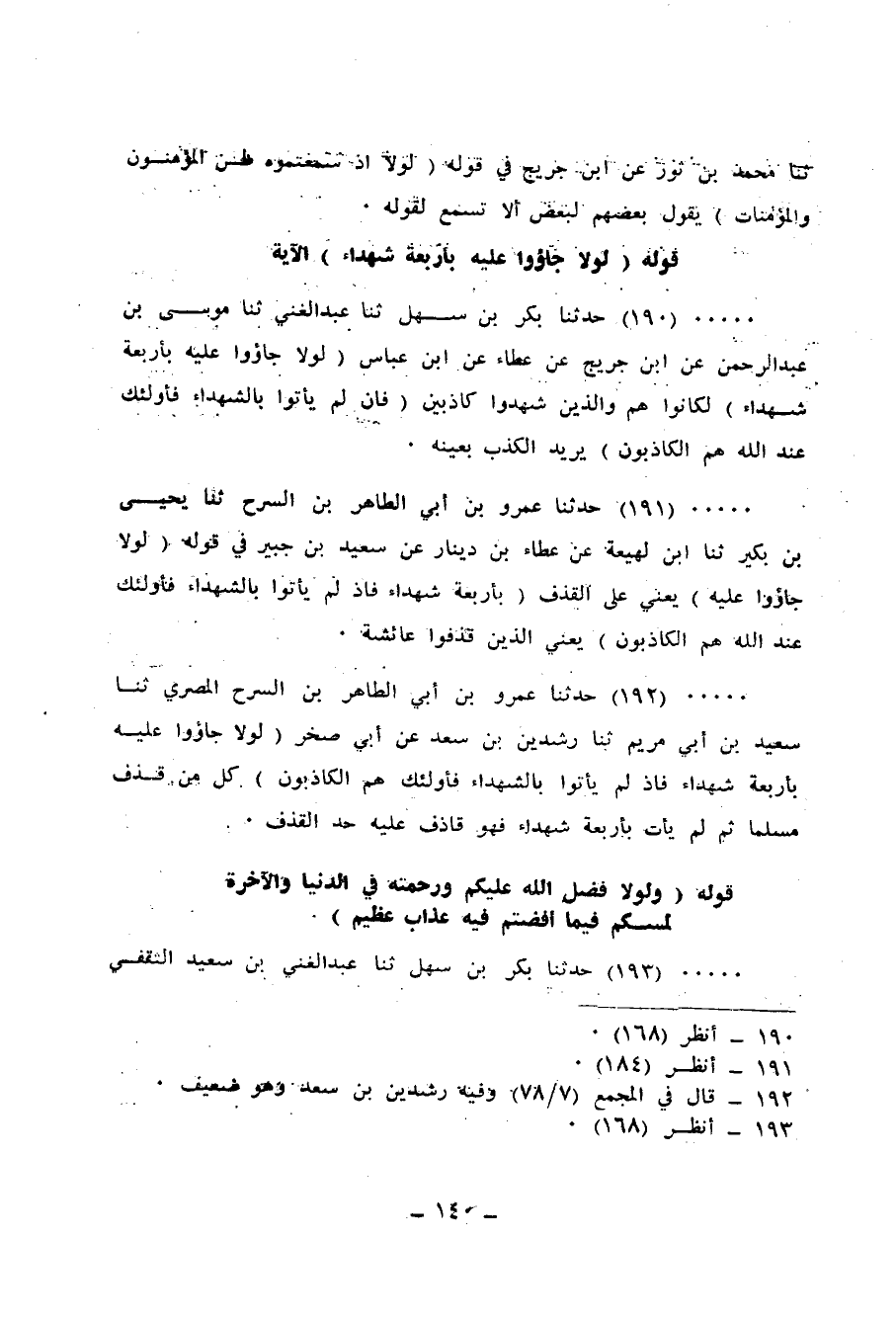 191 - حَدَّثَنَا عَمْرُو بْنُ أَبِي الطَّاهِرِ بْنِ السَّرْحِ، ثنا يَحْيَى بْنُ بُكَيْرٍ، ثنا ابْنُ لَهِيعَةَ، عَنْ عَطَاءِ بْنِ دِينَارٍ، عَنْ سَعِيدِ بْنِ جُبَيْرٍ فِي قَوْلِهِ " {§لَوْلَا جَاءُوا عَلَيْهِ} يَعْنِي: «عَلَى الْقَذْفِ» ، {بِأَرْبَعَةِ شُهَدَاءَ فَإِذْ لَمْ يَأْتُوا بِالشُّهَدَاءِ فَأُولَئِكَ عِنْدَ اللهِ هُمُ الْكَاذِبُونَ} [النور: 13] يَعْنِي: «الَّذِينَ قَذَفُوا عَائِشَةَ»