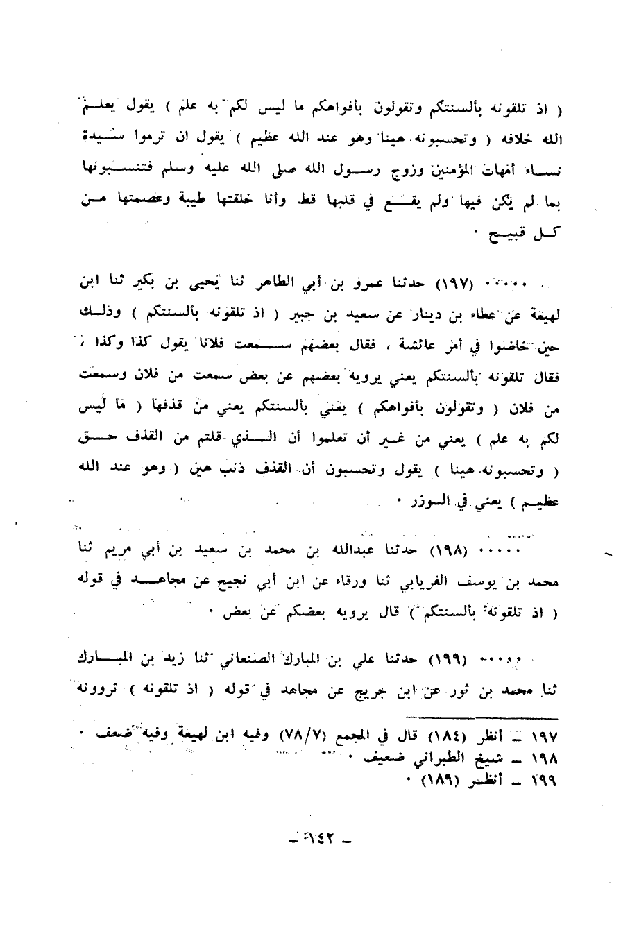 197 - حَدَّثَنَا عَمْرُو بْنُ أَبِي الطَّاهِرِ، ثنا يَحْيَى بْنُ بُكَيْرٍ، ثنا ابْنُ لَهِيعَةَ، عَنْ عَطَاءِ بْنِ دِينَارٍ، عَنْ سَعِيدِ بْنِ جُبَيْرٍ: " {§إِذْ تَلَقَّوْنَهُ بِأَلْسِنَتِكُمْ} [النور: 15] «وَذَلِكَ حِينَ خَاضُوا فِي أَمْرِ عَائِشَةَ، فَقَالَ بَعْضُهُمْ سَمِعْتُ فُلَانًا يَقُولُ كَذَا وَكَذَا» ، فَقَالَ {تَلَقَّوْنَهُ بِأَلْسِنَتِكُمْ} [النور: 15] ، يَعْنِي: «يَرْوِيهِ بَعْضُهُمْ عَنْ بَعْضٍ سَمِعْتُ مِنْ فُلَانٍ، وَسَمِعْتُ مِنْ فُلَانٍ» ، {وَتَقُولُونَ بِأَفْوَاهِكُمْ} [النور: 15] يَعْنِي: «بِأَلْسِنَتِكُمْ - يَعْنِي مِنْ قَذْفِهَا -» ، {مَا لَيْسَ لَكُمْ بِهِ عِلْمٌ} [النور: 15] يَعْنِي: «مِنْ غَيْرِ أَنْ تَعْلَمُوا أَنَّ الَّذِي قُلْتُمْ مِنَ الْقَذْفِ حَقٌّ» ، {وَتَحْسَبُونَهُ هَيِّنًا} [النور: 15] يَقُولُ: «وَتَحْسَبُونَ أَنَّ الْقَذْفَ ذَنْبٌ هَيِّنٌ» ، {وَهُوَ عِنْدَ اللهِ عَظِيمٌ} [النور: 15] يَعْنِي: «فِي الْوِزْرِ»