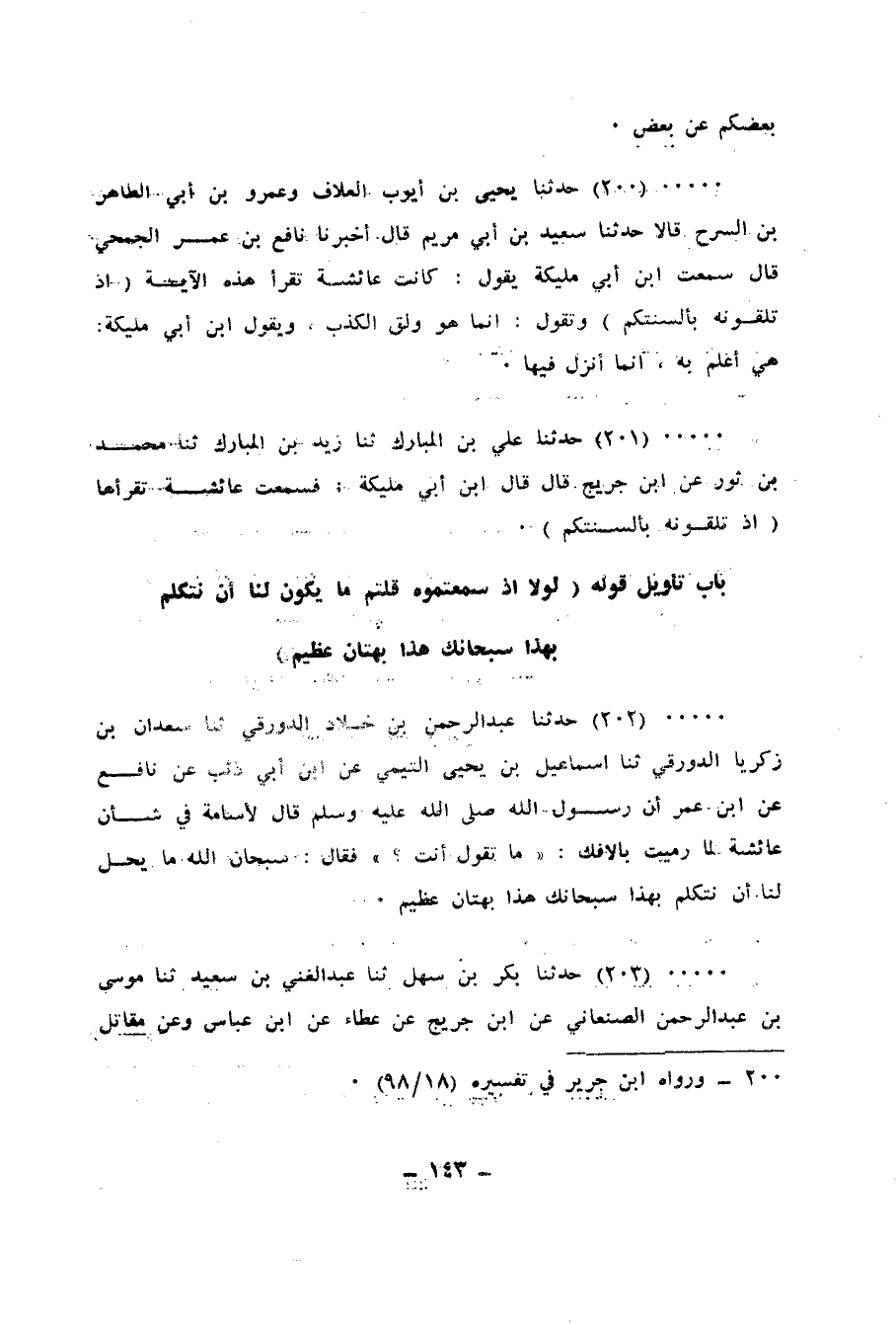 203 - حَدَّثَنَا بَكْرُ بْنُ سَهْلٍ، ثنا عَبْدُ الْغَنِيِّ بْنُ سَعِيدٍ، ثنا مُوسَى بْنُ عَبْدِ الرَّحْمَنِ الصَّنْعَانِيُّ، عَنِ ابْنِ جُرَيْجٍ، عَنْ عَطَاءٍ، عَنِ ابْنِ عَبَّاسٍ، وَعَنْ مُقَاتِلِ بْنِ سُلَيْمَانَ، عَنِ الضَّحَّاكِ بْنِ مُزَاحِمٍ، عَنِ ابْنِ عَبَّاسٍ: {لَوْلَا إِذْ سَمِعْتُمُوهُ} [النور: 12] ، «يُرِيدُ أَفَلَا سَمِعْتُمُوهُ» ، {قُلْتُمْ مَا يَكُونُ لَنَا أَنْ نَتَكَلَّمَ بِهَذَا سُبْحَانَكَ هَذَا بُهْتَانٌ عَظِيمٌ} [النور: 16] ، " §يُرِيدُ بِالْبُهْتَانِ الِافْتِرَاءَ الْعَظِيمَ، مِثْلَ قَوْلِهِ فِي مَرْيَمَ {وَقَوْلُهُمْ عَلَى مَرْيَمَ بُهْتَانًا عَظِيمًا} [النساء: 156] "