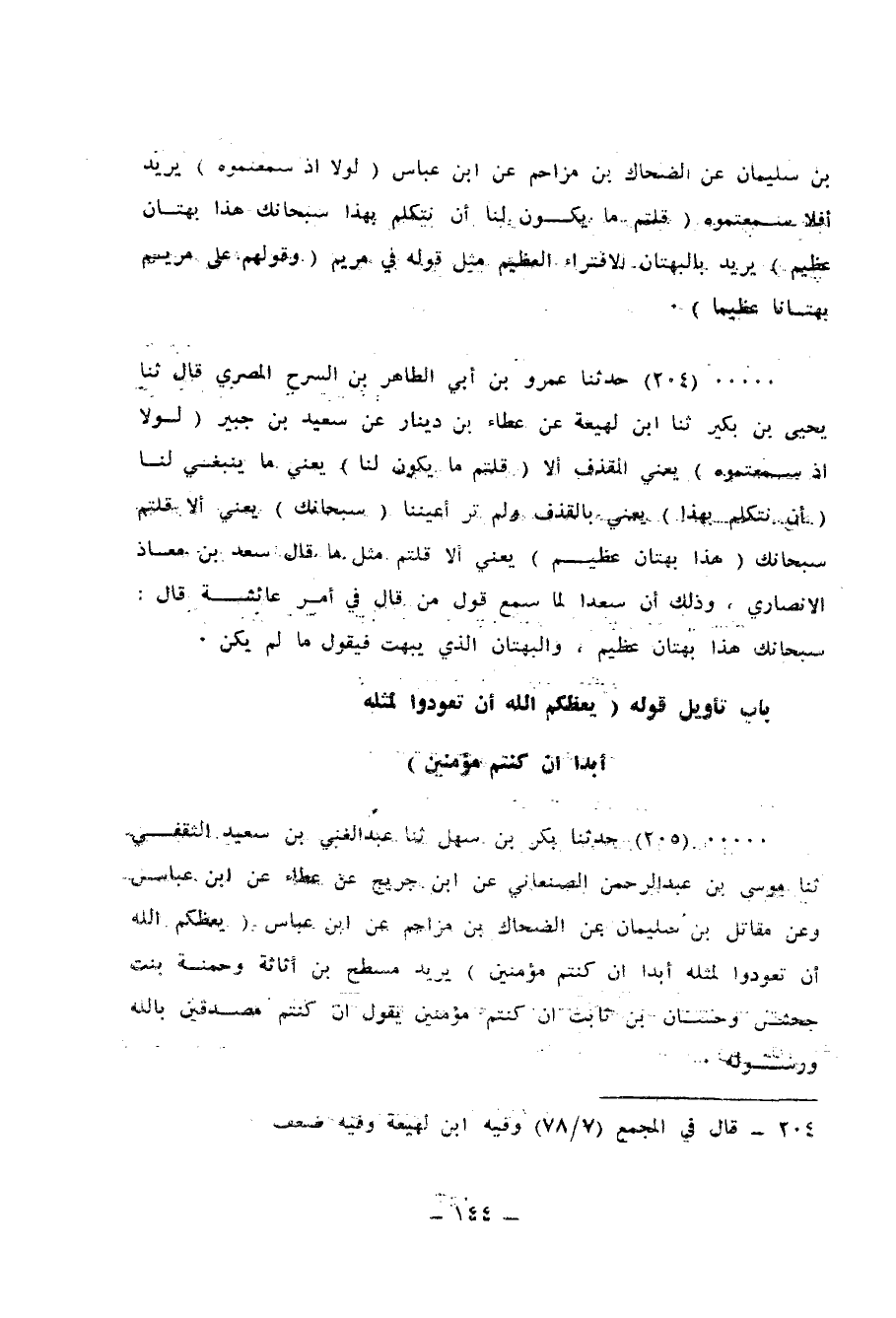 204 - حَدَّثَنَا عَمْرُو بْنُ أَبِي الطَّاهِرِ بْنِ السَّرْحِ الْمِصْرِيُّ، قَالَ: ثنا يَحْيَى بْنُ بُكَيْرٍ، ثنا ابْنُ لَهِيعَةَ، عَنْ عَطَاءِ بْنِ دِينَارٍ، عَنْ سَعِيدِ بْنِ جُبَيْرٍ: " {لَوْلَا إِذْ سَمِعْتُمُوهُ} [النور: 12] ، يَعْنِي: «الْقَذْفَ» ، أَلَا {قُلْتُمْ مَا يَكُونُ لَنَا} [النور: 16] ، يَعْنِي: «مَا يَنْبَغِي لَنَا» ، {أَنْ نَتَكَلَّمَ بِهَذَا} [النور: 16] يَعْنِي: «بالْقَذْفَ، وَلَمْ تَرَ أَعْيُنُنَا» ، {سُبْحَانَكَ} [النور: 12] يَعْنِي: «أَلَا قُلْتُمْ سُبْحَانَكَ» ، {هَذَا بُهْتَانٌ عَظِيمٌ} [النور: 16] يَعْنِي: " §أَلَا قُلْتُمْ مِثْلَ مَا قَالَ سَعْدُ بْنُ مُعَاذٍ الْأَنْصَارِيُّ، وَذَلِكَ أَنَّ سَعْدًا لَمَّا سَمِعَ قَوْلَ مَنْ قَالَ فِي أَمْرِ عَائِشَةَ قَالَ: سُبْحَانَكَ، هَذَا بُهْتَانٌ عَظِيمٌ، وَالْبُهْتَانُ الَّذِي يَبْهَتُ فَيَقُولُ مَا لَمْ يَكُنْ "