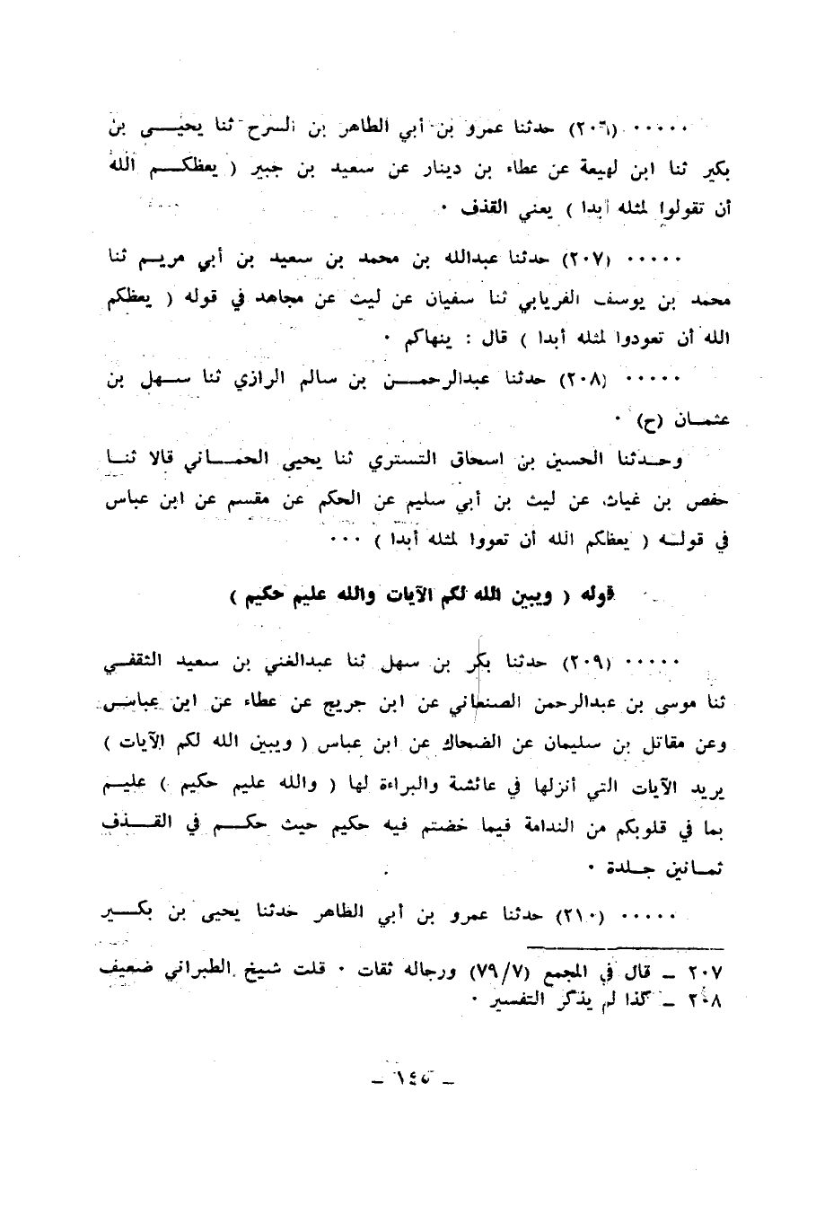 206 - حَدَّثَنَا عَمْرُو بْنُ أَبِي الطَّاهِرِ بْنِ السَّرْحِ، ثنا يَحْيَى بْنُ بُكَيْرٍ، ثنا ابْنُ لَهِيعَةَ، عَنْ عَطَاءِ بْنِ دِينَارٍ، عَنْ سَعِيدِ بْنِ جُبَيْرٍ: {§يَعِظُكُمُ اللهُ أَنْ تَعُودُوا لِمِثْلِهِ أَبَدًا} [النور: 17] يَعْنِي: «الْقَذْفَ»
