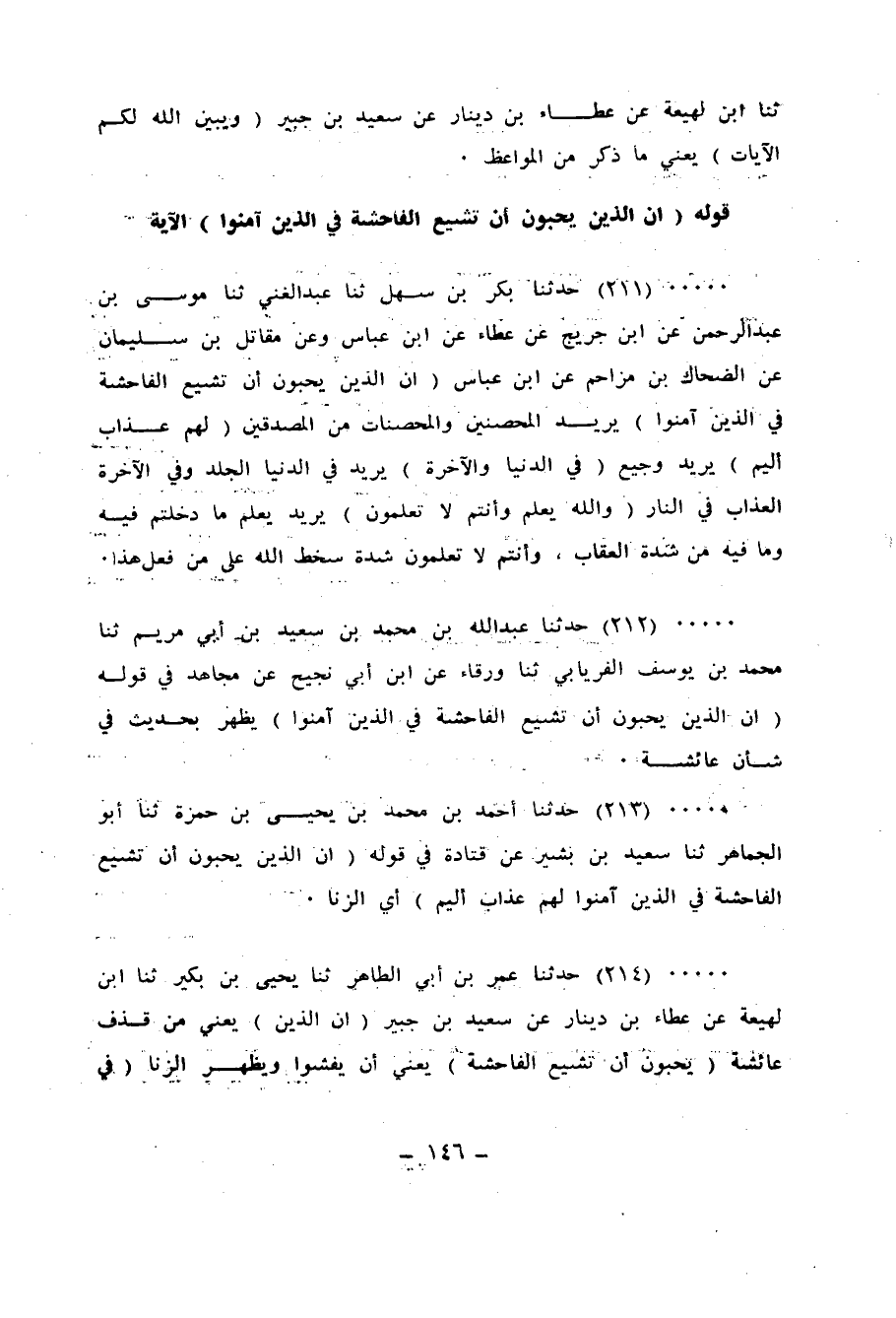 214 - حَدَّثَنَا عَمْرُو بْنُ أَبِي الطَّاهِرِ، ثنا يَحْيَى بْنُ بُكَيْرٍ، ثنا ابْنُ لَهِيعَةَ، عَنْ عَطَاءِ بْنِ دِينَارٍ، عَنْ سَعِيدِ بْنِ جُبَيْرٍ: {إِنَّ الَّذِينَ} [النور: 19] يَعْنِي: «مَنْ قَذَفَ عَائِشَةَ» ، {يُحِبُّونَ أَنْ تَشِيعَ الْفَاحِشَةُ} [النور: 19] يَعْنِي: «أَنْ يَفْشُوَ وَيَظْهَرَ الزِّنَا» ، {فِي الَّذِينَ آمَنُوا} [النور: 19] يَعْنِي: «صَفْوَانَ وَعَائِشَةَ» ، {لَهُمْ عَذَابٌ أَلِيمٌ} [النور: 19] يَعْنِي: «وَجِيعٌ» ، {فِي الدُّنْيَا وَالْآخِرَةِ} [النور: 19] " §فَكَانَ عَذَابُ عَبْدِ اللهِ بْنِ أُبَيٍّ فِي الدُّنْيَا الْحَدَّ، وَفِي الْآخِرَةِ عَذَابَ النَّارِ، {وَاللهُ يَعْلَمُ وَأَنْتُمْ لَا تَعْلَمُونَ} [البقرة: 216] "