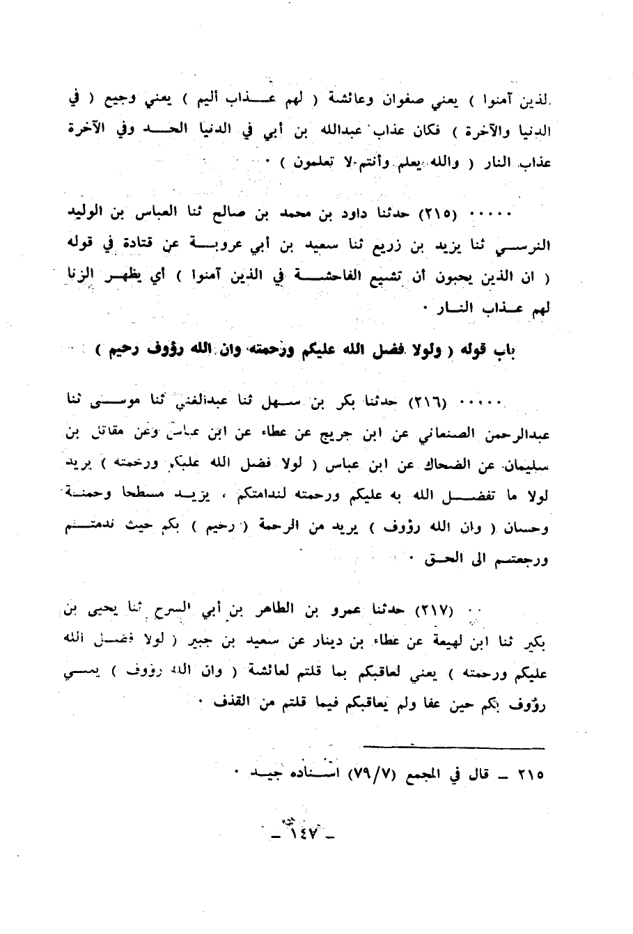 217 - حَدَّثَنَا عَمْرُو بْنُ الطَّاهِرِ بْنِ السَّرْحِ، ثنا يَحْيَى بْنُ بُكَيْرٍ، ثنا ابْنُ لَهِيعَةَ، عَنْ عَطَاءِ بْنِ دِينَارٍ، عَنْ سَعِيدِ بْنِ جُبَيْرٍ: {لَوْلَا فَضْلُ اللهِ عَلَيْكُمْ وَرَحْمَتُهُ} [النور: 20] يَعْنِي: «§لَعَاقَبَكُمْ بِمَا قُلْتُمْ لِعَائِشَةَ» ، {وَأَنَّ اللهَ رَءُوفٌ} يَعْنِي: «رَؤُوفٌ بِكُمْ حِينَ عَفَا وَلَمْ يُعَاقِبْكُمْ فِيمَا قُلْتُمْ مِنَ الْقَذْفِ»