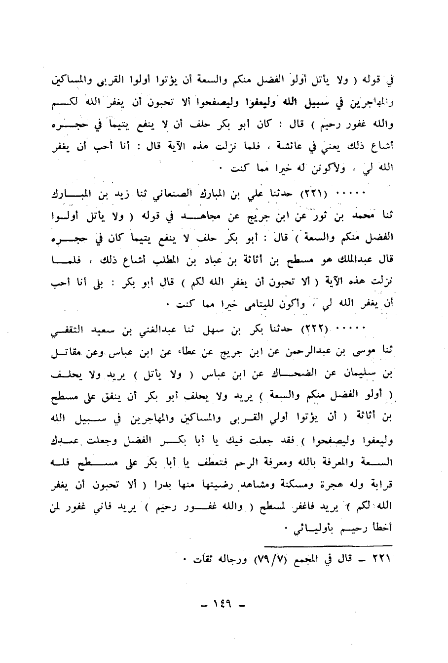 222 - حَدَّثَنَا بَكْرُ بْنُ سَهْلٍ، ثنا عَبْدُ الْغَنِيِّ بْنُ سَعِيدٍ الثَّقَفِيُّ، ثنا مُوسَى بْنُ عَبْدِ الرَّحْمَنِ، عَنِ ابْنِ جُرَيْجٍ، عَنْ عَطَاءٍ، عَنِ ابْنِ عَبَّاسٍ، وَعَنْ مُقَاتِلِ بْنِ سُلَيْمَانَ، عَنِ الضَّحَّاكِ، عَنِ ابْنِ عَبَّاسٍ: " {وَلَا يَأْتَلِ} [النور: 22] «يُرِيدُ وَلَا يَحْلِفُ» ، {أُولُو الْفَضْلِ مِنْكُمْ وَالسَّعَة} «يُرِيدُ وَلَا يَحْلِفُ أَبُو بَكْرٍ أَنْ يُنْفِقَ عَلَى مِسْطَحِ بْنِ أُثَاثَةَ» ، {أَنْ يُؤْتُوا أُولِي الْقُرْبَى وَالْمَسَاكِينَ وَالْمُهَاجِرِينَ فِي سَبِيلِ اللهِ وَلْيَعْفُوا وَلْيَصْفَحُوا} [النور: 22] «§فَقَدْ جَعَلْتُ فِيكَ يَا أَبَا بَكْرٍ الْفَضْلَ، وَجَعَلْتُ عِنْدَكَ السَّعَةَ وَالْمَعْرِفَةَ بِاللهِ وَمَعْرِفَةَ الرَّحِمِ، فَتَعَطَّفْ يَا أَبَا بَكْرٍ عَلَى مِسْطَحٍ فَلَهُ قَرَابَةٌ وَلَهُ هِجْرَةٌ وَمَسْكَنَةٌ وَمَشَاهِدُ رَضِيتُهَا مِنْهَا بَدْرًا» ، {أَلَا تُحِبُّونَ أَنْ يَغْفِرَ اللهُ لَكُمْ} [النور: 22] «يُرِيدُ فَاغْفِرْ لمِسْطَحٍ» ، {وَاللهُ غَفُورٌ رَحِيمٌ} [البقرة: 218] «يُرِيدُ فَإِنِّي غَفُورٌ لِمَنْ أَخْطَأَ رَحِيمٌ بِأَوْلِيَائِي»