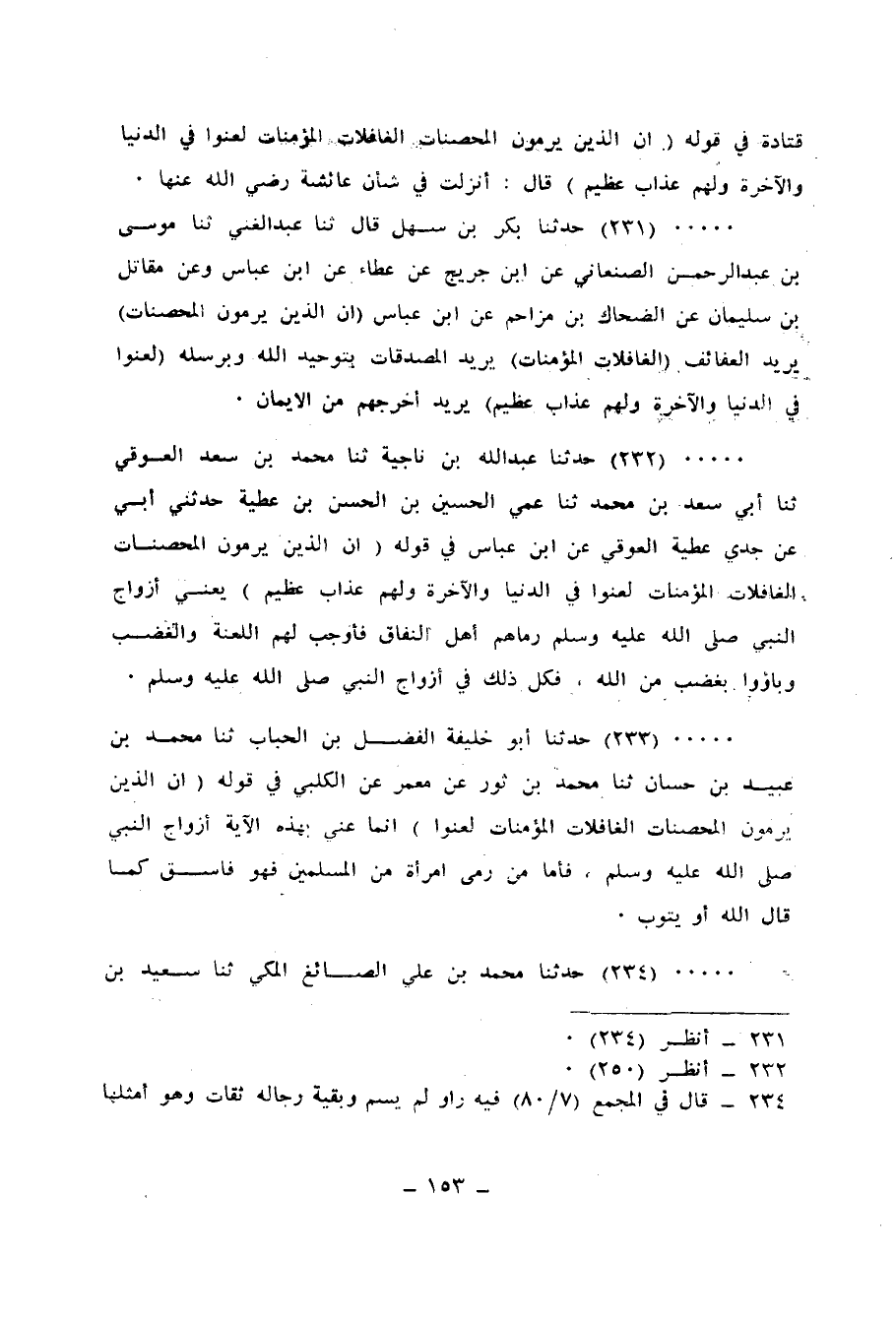234 - حَدَّثَنَا مُحَمَّدُ بْنُ عَلِيٍّ الصَّائِغُ الْمَكِّيُّ، ثنا سَعِيدُ بْنُ مَنْصُورٍ، حَدَّثَنَا هُشَيْمٌ، قَالَ: أنا الْعَوَّامُ بْنُ حَوْشَبٍ، ثنا شَيْخٌ، مِنْ بَنِي كَاهِلٍ، عَنِ ابْنِ عَبَّاسٍ، أَنَّهُ قَرَأَ سُورَةَ النُّورِ فَفَسَّرَهَا، فَلَمَّا أَتَى عَلَى هَذِهِ الْآيَةِ {إِنَّ الَّذِينَ يَرْمُونَ الْمُحْصَنَاتِ الْغَافِلَاتِ الْمُؤْمِنَاتِ لُعِنُوا فِي الدُّنْيَا وَالْآخِرَةِ وَلَهُمْ عَذَابٌ عَظِيمٌ} [النور: 23] ، قَالَ: «هَذِهِ فِي عَائِشَةَ وَأَزْوَاجِ النَّبِيِّ صَلَّى اللهُ عَلَيْهِ وَسَلَّمَ، §وَلَمْ يَجْعَلْ لِمَنْ فَعَلَ ذَلِكَ تَوْبَةً، وَجَعَلَ لِمَنْ رَمَى امْرَأَةً مِنَ الْمُؤْمِنَاتِ مِنْ غَيْرِ أَزْوَاجِ النَّبِيِّ صَلَّى اللهُ عَلَيْهِ وَسَلَّمَ التَّوْبَةَ» ، ثُمَّ قَرَأَ {وَالَّذِينَ يَرْمُونَ الْمُحْصَنَاتِ ثُمَّ لَمْ يَأْتُوا بِأَرْبَعَةِ شُهَدَاءَ فَاجْلِدُوهُمْ ثَمَانِينَ جَلْدَةً وَلَا تَقْبَلُوا لَهُمْ شَهَادَةً أَبَدًا وَأُولَئِكَ هُمُ الْفَاسِقُونَ} [النور: 4] «فَجَعَلَ لِهَؤُلَاءِ تَوْبَةً» ، {إِلَّا الَّذِينَ تَابُوا مِنْ بَعْدِ ذَلِكَ وَأَصْلَحُوا فَإِنَّ اللهَ غَفُورٌ رَحِيمٌ} [آل عمران: 89] «فَجَعَلَ لِمَنْ قَذَفَ امْرَأَةً مِنَ الْمُؤْمِنِينَ التَّوْبَةَ وَلَمْ يَجْعَلْ لِمَنْ قَذَفَ امْرَأَةً مِنْ أَزْوَاجِ النَّبِيِّ صَلَّى اللهُ عَلَيْهِ وَسَلَّمَ تَوْبَةً» ، ثُمَّ تَلَا هَذِهِ الْآيَةَ {لُعِنُوا فِي الدُّنْيَا وَالْآخِرَةِ وَلَهُمْ عَذَابٌ عَظِيمٌ} [النور: 23] «فَهَمَّ بَعْضُ الْقَوْمِ أَنْ يَقُومَ إِلَى ابْنِ عَبَّاسٍ لَيُقَبِّلَ رَأْسَهُ بِحُسْنِ مَا فَسَّرَ»
