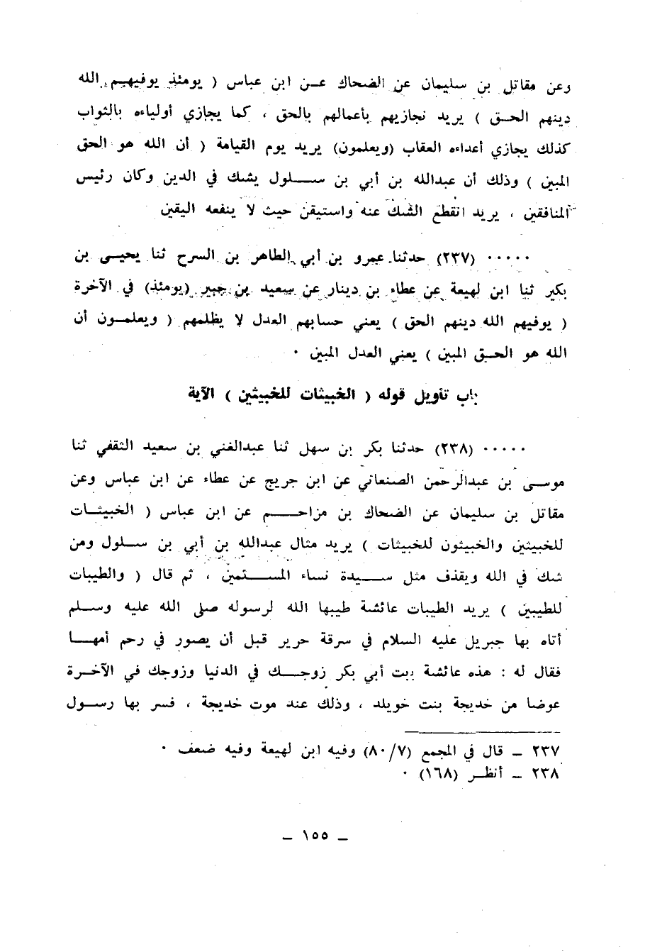 238 - حَدَّثَنَا بَكْرُ بْنُ سَهْلٍ، ثنا عَبْدُ الْغَنِيِّ بْنُ سَعِيدٍ الثَّقَفِيُّ، ثنا مُوسَى بْنُ عَبْدِ الرَّحْمَنِ الصَّنْعَانِيُّ، عَنِ ابْنِ جُرَيْجٍ، عَنْ عَطَاءٍ، عَنِ ابْنِ عَبَّاسٍ، وَعَنْ مُقَاتِلِ بْنِ سُلَيْمَانَ، عَنِ الضَّحَّاكِ بْنِ مُزَاحِمٍ، عَنِ ابْنِ عَبَّاسٍ: " {الْخَبِيثَاتُ لِلْخَبِيثِينَ وَالْخَبِيثُونَ لِلْخَبِيثَاتِ} [النور: 26] «يُرِيدُ أَمْثَالَ عَبْدِ اللهِ بْنِ أُبَيٍّ ابْنِ سَلُولَ، وَمَنْ شَكَّ فِي اللهِ وَيَقْذِفُ مِثْلَ سَيِّدَةِ نِسَاءِ الْمُسْلِمِينَ» ، ثُمَّ قَالَ: {وَالطَّيِّبَاتُ لِلطَّيِّبِينَ} [النور: 26] " يُرِيدُ الطَّيِّبَاتِ عَائِشَةَ طَيَّبَهَا اللهُ لِرَسُولِهِ صَلَّى اللهُ عَلَيْهِ وَسَلَّمَ، أَتَاهُ بِهَا جِبْرِيلُ عَلَيْهِ السَّلَامُ فِي سَرَقَةِ حَرِيرٍ قَبْلَ أَنْ يُصَوَّرَ فِي رَحِمِ أُمِّهَا، فَقَالَ لَهُ: هَذِهِ §عَائِشَةُ بِنْتُ أَبِي بَكْرٍ زَوْجَتُكَ فِي الدُّنْيَا وَزَوْجَتُكَ فِي الْآخِرَةِ، عِوَضًا مِنْ خَدِيجَةَ بِنْتِ خُوَيْلِدٍ، وَذَلِكَ عِنْدَ مَوْتِ خَدِيجَةَ فَسُرَّ بِهَا رَسُولُ اللهِ صَلَّى اللهُ عَلَيْهِ وَسَلَّمَ لِنَفْسِهِ وَقَرَّ بِهَا عَيْنًا "، ثُمَّ قَالَ: {وَالطَّيِّبُونَ لِلطَّيِّبَاتِ} [النور: 26] «يُرِيدُ رَسُولَ اللهِ صَلَّى اللهُ عَلَيْهِ وَسَلَّمَ طَيَّبَهُ اللهُ لِنَفْسِهِ وَجَعَلَهُ سَيِّدَ وَلَدِ آدَمَ» ، {الطَّيِّبَاتُ} [النور: 26] " يُرِيدُ عَائِشَةَ رَضِيَ اللهُ عَنْهَا