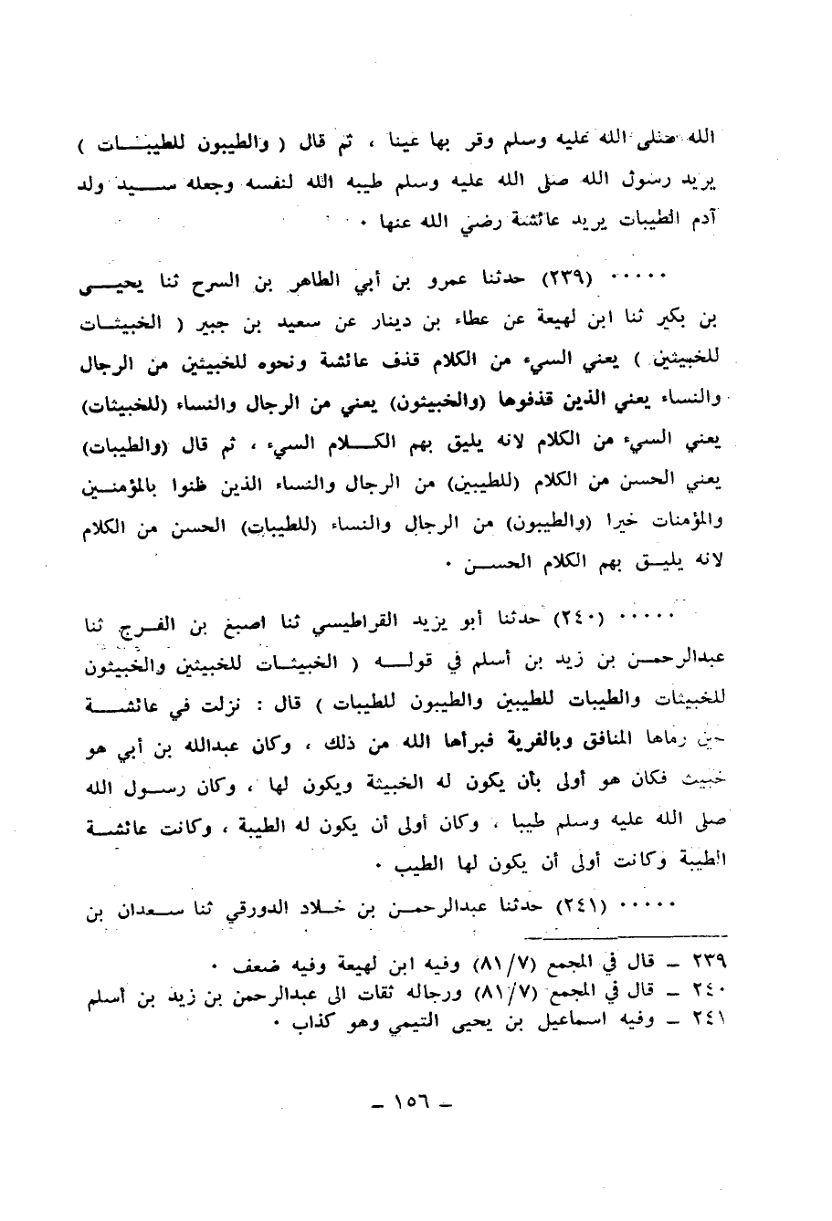 240 - حَدَّثَنَا أَبُو يَزِيدَ الْقَرَاطِيسِيُّ، ثنا أَصْبَغُ بْنُ الْفَرَجِ، ثنا عَبْدُ الرَّحْمَنِ بْنُ زَيْدِ بْنِ أَسْلَمَ، فِي قَوْلِهِ: {الْخَبِيثَاتُ لِلْخَبِيثِينَ وَالْخَبِيثُونَ لِلْخَبِيثَاتِ وَالطَّيِّبَاتُ لِلطَّيِّبِينَ وَالطَّيِّبُونَ لِلطَّيِّبَاتِ} [النور: 26] ، قَالَ: «نَزَلَتْ فِي عَائِشَةَ حِينَ §رَمَاهَا الْمُنَافِقُ بِالْبُهْتَانِ وَبِالْفِرْيَةِ، فَبَرَّأَهَا اللهُ مِنْ ذَلِكَ، وَكَانَ عَبْدُ اللهِ بْنُ أُبَيٍّ هُوَ خَبِيثٌ فَكَانَ هُوَ أَوْلَى بِأَنْ يَكُونَ لَهُ الْخَبِيثَةُ وَيَكُونَ لَهَا، وَكَانَ رَسُولُ اللهِ صَلَّى اللهُ عَلَيْهِ وَسَلَّمَ طَيِّبًا، وَكَانَ أَوْلَى أَنْ يَكُونَ لَهُ الطَّيِّبَةُ، فَكَانَتْ عَائِشَةُ الطَّيِّبَةَ، وَكَانَتْ أَوْلَى أَنْ يَكُونَ لَهَا الطَّيِّبُ»