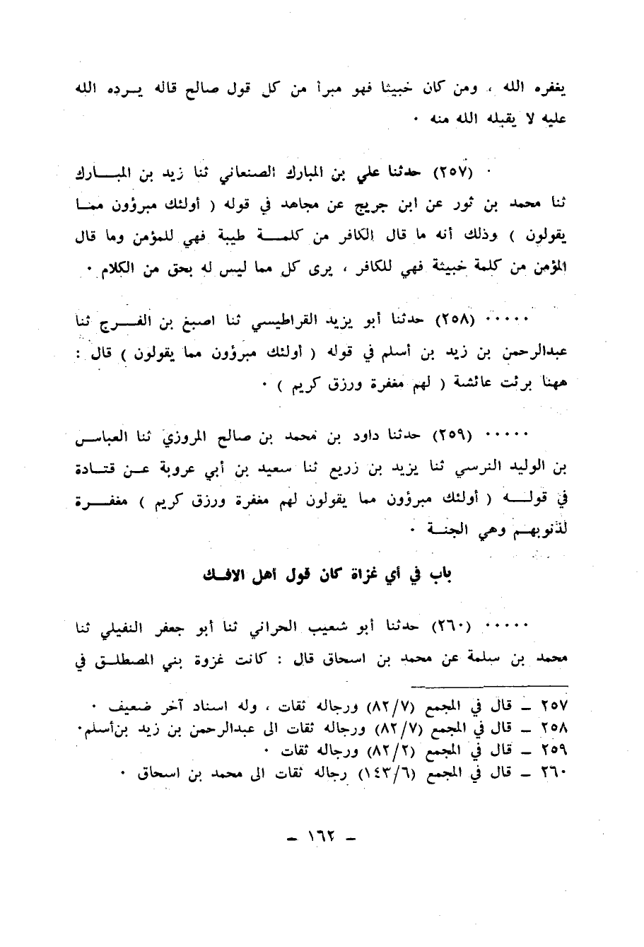 260 - حَدَّثَنَا أَبُو شُعَيْبٍ الْحَرَّانِيُّ، ثنا أَبُو جَعْفَرٍ النُّفَيْلِيُّ، ثنا مُحَمَّدُ بْنُ سَلَمَةَ، عَنْ مُحَمَّدِ بْنِ إِسْحَاقَ، قَالَ: «كَانَتْ §غَزْوَةَ بَنِي الْمُصْطَلِقِ فِي شَعْبَانَ سَنَةَ سِتٍّ، وَفِي تِلْكَ الْغَزْوَةِ خَرَجَ رَسُولُ اللهِ صَلَّى اللهُ عَلَيْهِ وَسَلَّمَ بِعَائِشَةَ مَعَهُ أَقْرَعَ بَيْنَ نِسَائِهِ، فَخَرَجَ سَهْمُهَا وَفِي تِلْكَ الْغَزْوَةِ قَالَ فِيهَا أَهْلُ الْإِفْكِ مَا قَالُوا، فَأَنْزَلَ اللهُ عَزَّ وَجَلَّ بَرَاءَتَهَا»