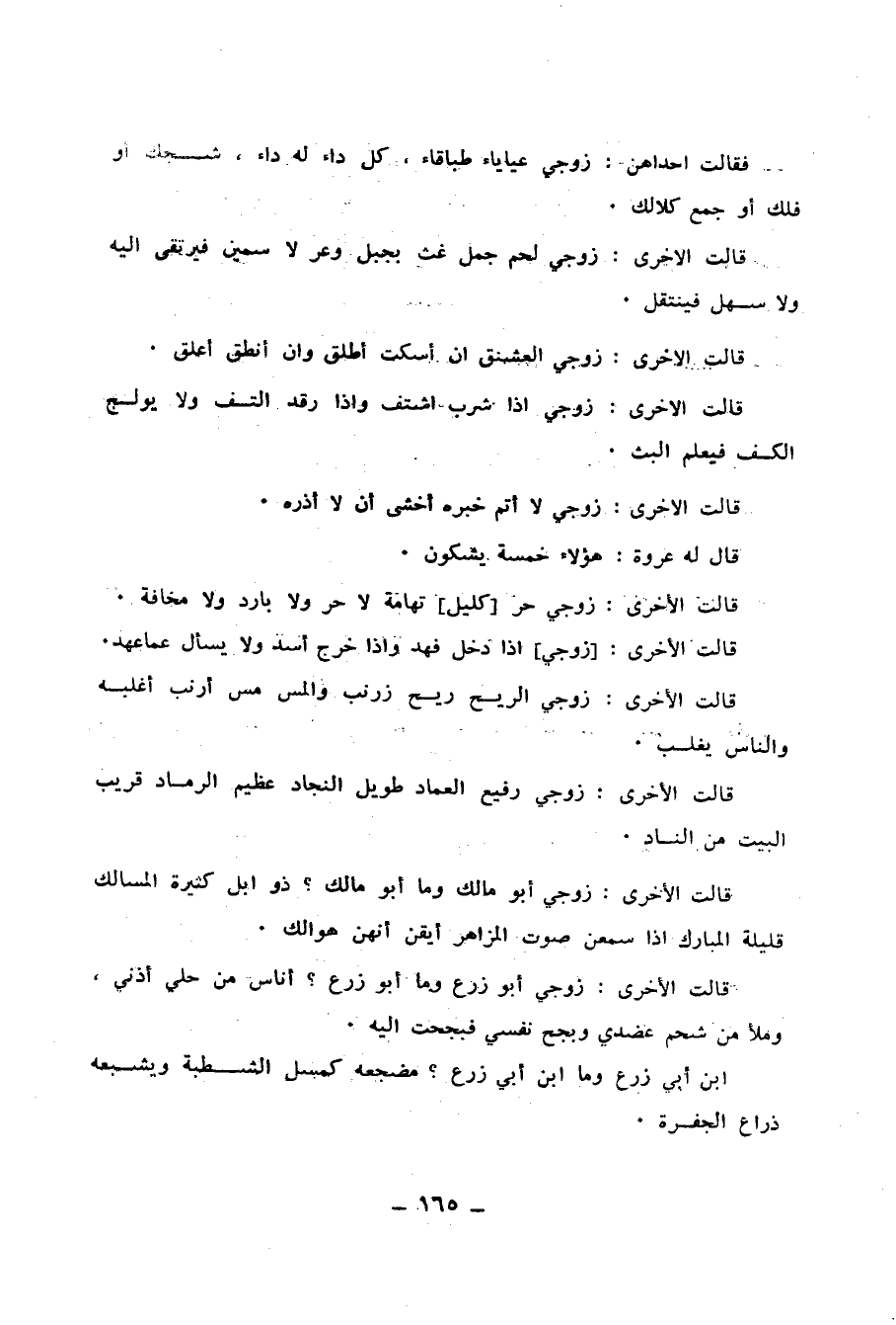 قَالَتِ الأُخْرَى : زَوْجِي إِذَا شَرِبَ اشْتَفَّ ، وَإِذَا رَقَدَ الْتَفَّ ، وَلاَ يُولِجُ الْكَفَّ فَيَعْلَمُ الْبَثَّ . قَالَتِ الأُخْرَى : زَوْجِي لاَ أُتِمُّ خَبَرَهُ ، أَخْشَى أَنْ لاَ أَذَرَهُ . قَالَ لَهُ عُرْوَةُ : هَؤُلاَءِ خَمْسَةٌ يَشْكُونَ . قَالَتِ الأُخْرَى : زَوْجِي حُرٌّ كَلَيْلِ تِهَامَةَ لاَ حَرٌّ ، وَلاَ بَارِدٌ ، وَلاَ مَخَافَةَ . قَالَتِ الأُخْرَى : زَوْجِي إِذَا دَخَلَ فَهِدَ وَإِذَا خَرَجَ أَسِدَ ، وَلاَ يَسْأَلُ عَمَّا عَهِدَ . قَالَتِ الأُخْرَى : زَوْجِي الرِّيحُ رِيحُ زَرْنَبٍ ، وَالْمَسُّ مَسُّ أَرْنَبٍ ، أَغْلِبُهُ وَالنَّاسَ يَغْلِبُ . قَالَتِ الأُخْرَى : زَوْجِي رُفَيْعُ الْعِمَادِ ، طَوِيلُ النِّجَادِ ، عَظِيمُ الرَّمَادِ ، قَرِيبُ الْبَيْتِ مِنَ النَّادِ . قَالَتِ الأُخْرَى : زَوْجِي أَبُو مَالِكٍ وَمَا أَبُو مَالِكٍ ؟ ذُو إِبِلٍ كَثِيرَةِ الْمَسَالِكِ ، قَلِيلَةِ الْمَبَارِكِ ، إِذَا سَمِعْنَ صَوْتَ الْمَزَاهِرِ أَيْقَنَّ أَنَّهُنَّ هَوَالِكُ . قَالَتِ الأُخْرَى : زَوْجِي أَبُو زَرْعٍ وَمَا أَبُو زَرْعٍ ؟ أَنَاسَ مِنْ حُلِيٍّ أُذُنَيَّ ، وَمَلأَ مِنْ شَحْمٍ عَضُدَيَّ ، وَبَجَحَ نَفْسِي فَبَجِحْتُ إِلَيْهِ . ابْنُ أَبِي زَرْعٍ وَمَا ابْنُ أَبِي زَرْعٍ ؟ مَضْجَعُهُ كَمَسَلِّ الشَّطْبَةِ ، وَيُشْبِعُهُ ذِرَاعُ الْجَفْرَةِ ،