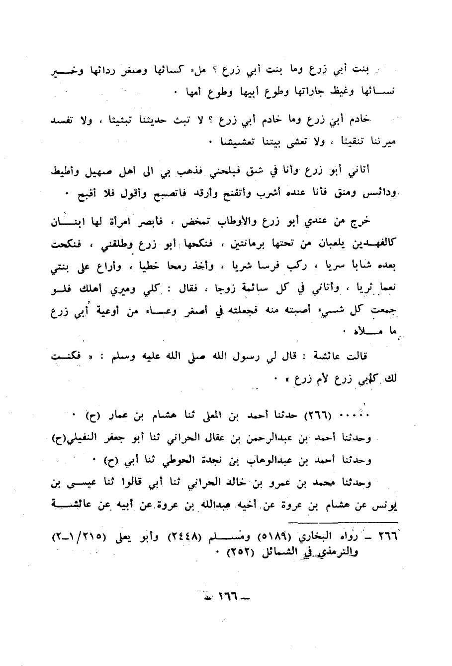 بِنْتُ أَبِي زَرْعٍ وَمَا بِنْتُ أَبِي زَرْعٍ ؟ مِلْءُ كِسَائِهَا ، وَصِغَرُ رِدَائِهَا ، وَخَيْرُ نِسَائِهَا ، وَغَيْظُ جَارَاتِهَا ، وَطَوْعُ أَبِيهَا ، وَطَوْعُ أُمِّهَا . خَادِمُ أَبِي زَرْعٍ وَمَا خَادِمُ أَبِي زَرْعٍ ؟ لاَ تَبُثُّ حَدِيثَنَا تَبْثِيثًا ، وَلاَ تُفْسِدُ مِيرَتَنَا تَنْقِيثًا ، وَلاَ تَعَشَّى بَيْتَنَا تَعْشِيشًا . أَتَانِي أَبُو زَرْعٍ وَأَنَا فِي شِقٍّ فَبَلَحَنِي ، فَذَهَبَ بِي إِلَى أَهْلِ صَهِيلٍ وَأَطِيطٍ وَدَائِسٍ وَمُنَقٍّ ، فَأَنَا عِنْدَهُ أَشْرَبُ وَأَتَقَنَّحُ وَأَرْقُدُ فَأَتَصَبَّحُ ، وَأَقُولُ فَلاَ أُقَبَّحُ . خَرَجَ مِنْ عِنْدِي أَبُو زَرْعٍ وَالأَوْطَابُ تُمْخَضُ ، فَأَبْصَرَ امْرَأَةً لَهَا ابْنَانِ كَالْفَهْدَيْنِ يَلْعَبَانِ مِنْ تَحْتِهَا بِرُمَّانَتَيْنِ ، فَنَكَحَهَا أَبُو زَرْعٍ وَطَلَّقَنِي ، فَنَكَحْتُ بَعْدَهُ شَابًّا سَرِيًّا ، رَكِبَ فَرَسًا شَرِيًّا ، وَأَخَذَ رُمْحًا خَطِّيًّا ، وَأَرَاحَ عَلَى بِنْتِي نَعَمًا ثَرِيًّا ، وَأَتَانِي فِي كُلِّ سَائِمَةٍ زَوْجًا ، فَقَالَ : كُلِي وَمِيرِي أَهْلَكِ فَلَوْ جَمَعْتُ كُلَّ شَيْءٍ أَصَبْتُهُ مِنْهُ فَجَعَلْتُهُ فِي أَصْغَرِ وِعَاءٍ مِنْ أَوْعِيَةِ أَبِي زَرْعٍ مَا مَلأَهُ . قَالَتْ عَائِشَةُ : قَالَ لِي رَسُولُ اللهِ صَلَّى اللَّهُ عَلَيْهِ وَسَلَّمَ : فَكُنْتُ لَكِ كَأَبِي زَرْعٍ لأُمِّ زَرْعٍ.
