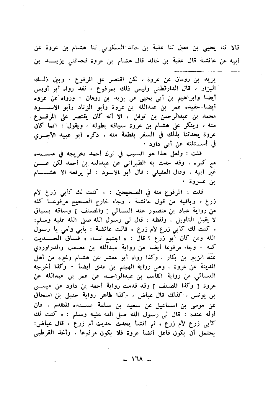 268 - حَدَّثَنَا مُعَاذُ بْنُ الْمُثَنَّى، وَعَبْدُ اللهِ بْنُ أَحْمَدَ بْنِ حَنْبَلٍ، قَالَا: ثنا يَحْيَى بْنُ مَعِينٍ، ثنا عُقْبَةُ بْنُ خَالِدٍ السَّكُونِيُّ، ثنا هِشَامُ بْنُ عُرْوَةَ، عَنْ أَبِيهِ، عَنْ عَائِشَةَ، قَالَ عُقْبَةُ بْنُ خَالِدٍ: قَالَ هِشَامُ بْنُ عُرْوَةَ: فَحَدَّثَنِي يَزِيدُ بْنُ -[169]- رُومَانَ، عَنْ عُرْوَةَ، عَنْ عَائِشَةَ، عَنِ النَّبِيِّ صَلَّى اللهُ عَلَيْهِ وَسَلَّمَ قَالَ: «اجْتَمَعَ إِحْدَى عَشْرَةَ امْرَأَةً فِي الْجَاهِلِيَّةِ فَتَعَاقَدْنَ أَنْ يَتَصَادَقْنَ بَيْنَهُنَّ وَلَا يَكْتُمْنَ مِنْ أَخْبَارِ أَزْوَاجِهِنَّ شَيْئًا» ، فَقَالَتِ الْأُولَى: زَوْجِي لَحْمُ جَمَلٍ غَثٍّ عَلَى رَأْسِ جَبَلٍ لَا سَهْلٍ فَيُرْتَقَى وَلَا سَمِينٍ فَيُنْتَقَلُ. قَالَتِ الثَّانِيَة: زَوْجِي لَا أَبُثُّ خَبَرَهُ، إِنِّي أَخَافُ أَنْ لَا أَذَرَهُ إِنْ أَذْكُرْهُ أَذْكُرْ عُجَرَهُ وَبُجَرَهُ. قَالَتِ الثَّالِثَةُ: زَوْجِي الْعَشَنَّقُ إِنْ أَنْطِقْ أُطَلَّقْ وَإِنْ أَسْكُتْ أُعَلَّقْ. قَالَتِ الرَّابِعَةُ: زَوْجِي إِنْ أَكَلَ لَفَّ وَإِنْ شَرِبَ اشْتَفَّ وَإِنِ اضْطَجَعَ الْتَفَّ وَلَا يُولِجُ الْكَفَّ لِيَعْلَمَ الْبَثَّ. قَالَتِ الْخَامِسَةُ: زَوْجِي عَيَايَاءُ طَبَاقَاءُ، كُلُّ دَاءٍ لَهُ دَاءٌ، شَجَّكِ -[170]- أَوْ فَلَّكِ أَوْ جَمَعَ كُلًّا لَكِ. قَالَتِ السَّادِسَةُ: زَوْجِي كَلَيْلِ تِهَامَةَ لَا حَرٌّ، وَلَا قَرٌّ، وَلَا مَخَافَةَ. قَالَتِ السَّابِعَةُ: زَوْجِي إِنْ دَخَلَ فَهِدَ، وَإِنْ خَرَجَ أَسِدَ، وَلَا يَسْأَلُ عَمَّا عَهِدَ. قَالَتِ الثَّامِنَةُ: زَوْجِي الْمَسُّ مَسُّ أَرْنَبٍ، وَالرِّيحُ رِيحُ زَرْنَبٍ، وَأَنَا أَغْلِبُهُ وَالنَّاسَ يَغْلِبُ. قَالَتِ التَّاسِعَةُ: زَوْجِي رُفَيْعُ الْعِمَادِ، طَوِيلُ النِّجَادِ، عَظِيمُ الرَّمَادِ قَرِيبُ الْبَيْتِ مِنَ النَّادِ. قَالَتِ الْعَاشِرَةُ: زَوْجِي مَالِكٌ هُوَ مَالِكٌ، وَمَا مَالِكٌ؟ مَالِكٌ خَيْرٌ مِنْ ذَلِكَ، لَهُ إِبِلٌ قَلِيلَاتُ الْمَسَارِحِ، كَثِيرَاتُ الْمَبَارِكِ، إِذَا سَمِعْنَ صَوْتَ الْمَزَاهِرِ أَيْقَنَّ أَنَّهُنَّ هَوَالِكُ. قَالَتِ الْحَادِيَةَ عَشْرَةَ: زَوْجِي أَبُو زَرْعٍ وَمَا أَبُو زَرْعٍ؟ أَنَاسَ مِنْ حُلِيٍّ أُذُنَيَّ، وَمَلَأَ مِنْ شَحْمِ عَضُدِيَّ، وَبَجَّحَنِي فَبَجِحَتْ إِلَيَّ نَفْسِي، وَجَدَنِي فِي أَهْلِ غُنَيْمَةٍ بِشِقٍّ فَجَعَلَنِي فِي أَهْلِ صَهِيلٍ وَأَطِيطٍ وَدَائِسٍ وَمُنَقٍّ، فَعِنْدَهُ أَقُولُ فَلَا أُقَبَّحُ، وَأَرْقُدُ فَأَتَصَبَّحُ وَأَشْرَبُ فَأَتَقَنَّحُ، أُمُّ أَبِي زَرْعٍ وَمَا أُمُّ أَبِي زَرْعٍ؟ عُكُومُهَا رَدَاحٌ، وَبَيْتُهَا فَسَاحٌ. ابْنُ أَبِي زَرْعٍ وَمَا ابْنُ أَبِي زَرْعٍ؟ مَضْجَعُهُ كَمَسَلِّ شَطْبَةٍ يُشْبِعُهُ ذِرَاعُ الْجَفْرَةِ. بِنْتُ أَبِي زَرْعٍ وَمَا بِنْتُ أَبِي زَرْعٍ؟ طَوْعُ أَبِيهَا وَطَوْعُ أُمِّهَا وَمِلْءُ كِسَائِهَا وَغَيْظُ جَارَتِهَا. جَارِيَةُ أَبِي زَرْعٍ وَمَا جَارِيَةُ أَبِي زَرْعٍ؟ لَا تَبُثُّ حَدِيثَنَا وَلَا تَمْلَأُ مِيرَتَنَا تَنْقِيثًا، لَا تَمْلَأُ بَيْتَنَا تَعْشِيشًا. خَرَجَ أَبُو زَرْعٍ وَالْأَوْطَابُ تُمْخَضُ، فَمَرَّ بِامْرَأَةٍ لَهَا ابْنَانِ لَهَا كَالْفَهْدَيْنِ يَلْعَبَانِ مِنْ تَحْتِ خَصْرِهَا بِرُمَّانَتَيْنِ، فَطَلَّقَنِي وَنَكَحَهَا، فَنَكَحْتُ بَعْدَهُ رَجُلًا سَرِيًّا، رَكِبَ شَرِيًّا، وَأَخَذَ خَطِّيًّا، وَأَرَاحَ عَلَيَّ نَعَمًا ثَرِيًّا، وَأَعْطَانِي مِنْ كُلِّ رَائِحَةٍ زَوْجًا، فَقَالَ: كُلِي أُمَّ زَرْعٍ وَمِيرِي أَهْلَكِ. فَلَوْ جَمَعْتُ كُلَّ شَيْءٍ أَعْطَانِيهِ مَا مَلَأَ أَصْغَرَ إِنَاءٍ مِنْ آنِيَةِ أَبِي زَرْعٍ "، فَقَالَتْ عَائِشَةُ: قَالَ لِي رَسُولُ اللهِ صَلَّى اللهُ عَل