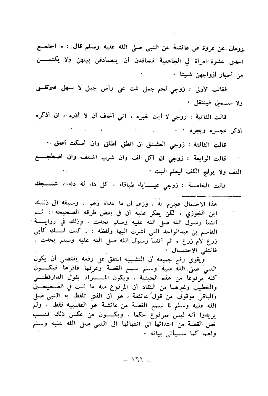 قَالَتِ السَّادِسَةُ : زَوْجِي كَلَيْلِ تِهَامَةَ لاَ حَرٌّ ، وَلاَ قَرٌّ ، وَلاَ مَخَافَةَ . قَالَتِ السَّابِعَةُ : زَوْجِي إِنْ دَخَلَ فَهِدَ ، وَإِنْ خَرَجَ أَسِدَ ، وَلاَ يَسْأَلُ عَمَّا عَهِدَ . قَالَتِ الثَّامِنَةُ : زَوْجِي الْمَسُّ مَسُّ أَرْنَبٍ ، وَالرِّيحُ رِيحُ زَرْنَبٍ ، وَأَنَا أَغْلِبُهُ وَالنَّاسَ يَغْلِبُ . قَالَتِ التَّاسِعَةُ : زَوْجِي رُفَيْعُ الْعِمَادِ ، طَوِيلُ النِّجَادِ ، عَظِيمُ الرَّمَادِ قَرِيبُ الْبَيْتِ مِنَ النَّادِ . قَالَتِ الْعَاشِرَةُ : زَوْجِي مَالِكٌ هُوَ مَالِكٌ ، وَمَا مَالِكٌ ؟ مَالِكٌ خَيْرٌ مِنْ ذَلِكَ ، لَهُ إِبِلٌ قَلِيلاَتُ الْمَسَارِحِ ، كَثِيرَاتُ الْمَبَارِكِ ، إِذَا سَمِعْنَ صَوْتَ الْمَزَاهِرِ أَيْقَنَّ أَنَّهُنَّ هَوَالِكُ . قَالَتِ الْحَادِيَةَ عَشْرَةَ : زَوْجِي أَبُو زَرْعٍ وَمَا أَبُو زَرْعٍ ؟ أَنَاسَ مِنْ حُلِيٍّ أُذُنَيَّ ، وَمَلأَ مِنْ شَحْمِ عَضُدِيَّ ، وَبَجَّحَنِي فَبَجِحَتْ إِلَيَّ نَفْسِي ، وَجَدَنِي فِي أَهْلِ غُنَيْمَةٍ بِشِقٍّ فَجَعَلَنِي فِي أَهْلِ صَهِيلٍ وَأَطِيطٍ وَدَائِسٍ وَمُنَقٍّ ، فَعِنْدَهُ أَقُولُ فَلاَ أُقَبَّحُ ، وَأَرْقُدُ فَأَتَصَبَّحُ وَأَشْرَبُ فَأَتَقَنَّحُ ، أُمُّ أَبِي زَرْعٍ وَمَا أُمُّ أَبِي زَرْعٍ ؟ عُكُومُهَا رَدَاحٌ ،