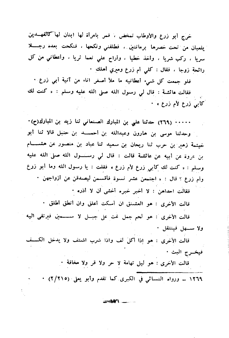 269 - حَدَّثَنَا عَلِيُّ بْنُ الْمُبَارَكِ الصَّنْعَانِيُّ، ثنا زَيْدُ بْنُ الْمُبَارَكِ، ح وَحَدَّثَنَا مُوسَى بْنُ هَارُونَ، وَعَبْدُ اللهِ بْنُ أَحْمَدَ بْنِ حَنْبَلٍ، قَالَا: ثنا أَبُو خَيْثَمَةَ زُهَيْرُ بْنُ حَرْبٍ، ثنا رَيْحَانُ بْنُ سَعِيدٍ، ثنا عَبَّادُ بْنُ مَنْصُورٍ، عَنْ هِشَامِ بْنِ عُرْوَةَ، عَنْ أَبِيهِ، عَنْ عَائِشَةَ، قَالَتْ: قَالَ لِي رَسُولُ اللهِ صَلَّى اللهُ عَلَيْهِ وَسَلَّمَ: «§كُنْتُ لَكِ كَأَبِي زَرْعٍ لِأُمِّ زَرْعٍ» ، فَقُلْتُ: يَا رَسُولَ اللهِ وَمَا أَبُو زَرْعٍ، وَأُمُّ زَرْعٍ؟، قَالَ: " اجْتَمَعْنَ عَشْرُ نِسْوَةٍ فَأَقْسَمْنَ لَيَصْدُقْنَ عَنْ أَزْوَاجِهِنَّ، فَقَالَتْ إِحْدَاهُنُّ: لَا أُخْبِرُ خَبَرَهُ أَخْشَى أَنْ لَا أَذَرَهُ. قَالَتِ الْأُخْرَى: هُوَ الْعَشَنَّقُ إِنْ أَسْكُتْ أُعَلَّقْ وَإِنْ أَنْطِقْ أُطَلَّقْ. قَالَتِ الْأُخْرَى: هُوَ لَحْمُ جَمَلٍ غَثٍّ عَلَى جَبَلٍ لَا سَمِينٍ فَيُرْتَقَى إِلَيْهِ وَلَا سَهْلٍ فَيُنْتَقَلُ. قَالَتِ الْأُخْرَى: هُوَ إِذَا أَكَلَ لَفَّ، وَإِذَا شَرِبَ اشْتَفَّ، وَلَا يَدْخُلُ الْكَفَّ فَيَخْرُجُ الْبَثَّ. قَالَتِ الْأُخْرَى: هُوَ لَيْلُ تِهَامَةَ لَا حَرٌّ، وَلَا قَرٌّ، وَلَا مَخَافَةَ -[172]-. قَالَتِ الْأُخْرَى: هُوَ إِذَا دَخَلَ فَهِدَ، وَإِذَا خَرَجَ أَسِدَ، وَلَا يَسْأَلُ عَمَّا عَهِدَ. قَالَتِ الْأُخْرَى: الرِّيحُ رِيحُ زَرْنَبٍ، وَالْمَسُّ مَسُّ أَرْنَبٍ، وَإِنَّمَا أَغْلِبُهُ وَالنَّاسَ يَغْلِبُ. قَالَتِ الْأُخْرَى: هُوَ طَوِيلُ الزِّنَادِ، رُفَيْعُ الْعِمَادِ، عَظِيمُ الرَّمَادِ، قَرِيبُ الْبَيْتِ مِنَ النَّادِ. قَالَتِ الْأُخْرَى: هُوَ مَالِكٌ وَمَا مَالِكٌ؟ لَهُ إِبِلٌ كَثِيرَاتُ الْمَسَالِكِ، قَلِيلَاتُ الْمَبَارِكِ، إِذَا سَمِعْنَ صَوْتَ الْمِزْمَارِ أَيْقَنَّ أَنَّهُنَّ هَوَالِكُ. قَالَتِ الْأُخْرَى: هُوَ أَبُو زَرْعٍ وَمَا أَبُو زَرْعٍ؟ صَاحِبُ نَعَمٍ وَزَرْعٍ، آنَسَنِي فَآنَسَتْ مِنْ حُلِيٍّ أُذُنَيَّ، وَمِنْ شَحْمٍ عَضُدِيَّ، وَبَجَّحَنِي فَبَجِحَتْ إِلَيَّ نَفْسِي، فَعِنْدَهُ أَرْقُدُ فَأَتَصَبَّحُ وَأَشْرَبُ فَأَتَقَمَّحُ وَأَقُولُ فَلَا أُقَبَّحُ، أَخَذَنِي مِنْ أَهْلِ بَيْتٍ بِشِقٍّ فَجَعَلَنِي فِي أَهْلِ صَهِيلٍ وَأَطِيطٍ وَدَائِسٍ وَمُنَقٍّ. ابْنُ أَبِي زَرْعٍ وَمَا ابْنُ أَبِي زَرْعٍ؟ مَرْقَدُهُ كَالشَّطْبَةِ، وَيَكْفِيهِ ذِرَاعُ الْقَصَبَةِ. بِنْتُ أَبِي زَرْعٍ وَمَا بِنْتُ أَبِي زَرْعٍ؟ مِلْءُ كِسَائِهَا وَعَطْفُ رِدَائِهَا، وَقُرَّةُ عَيْنٍ لِأَبِيهَا وَأُمِّهَا، وَزَيْنٌ لِأَهْلِهَا، وَغَيْرُ مُجَازٍ بِهَا. خَادِمُ أَبِي زَرْعٍ وَمَا خَادِمُ أَبِي زَرْعٍ؟ لَا تَفْشِي حَدِيثَنَا تَبْثِيثًا، وَلَا تُفْسِدُ مِيرَتَنَا تَنْقِيثًا. فَخَرَجَ مِنْ عِنْدِي أَبُو زَرْعٍ وَالْأَوْطَابُ تُمْخَضُ فَرَأَى امْرَأَةً مَعَهَا ابْنَانِ لَهَا كَالْفَهْدَيْنِ يَلْعَبَانِ مِنْ تَحْتِهَا بِرُمَّانَتَيْنِ، فَنَكَحَهَا وَطَلَّقَنِي، فَنَكَحْتُ بَعْدَهُ شَابًّا سَرِيًّا، فَخَرَجَ شَحِيًّا وَأَخَذَ خَطِّيًّا فَسَاقَ نَعَمًا ثَرِيًّا، وَأَعْطَانِي مِنْ كُلِّ سَائِمَةٍ زَوْجًا، وَقَالَ مِيرِي أَهْلَكِ يَا أُمَّ زَرْعٍ، فَقُلْتُ: لَوْ كَانَ هَذَا أَجْمَعُ فِي وِعَاءٍ مِنْ أَوْعِيَةِ أَبِي زَرْعٍ لَمْ تَمْلِهِ. قَالَتْ عَائِشَةُ: فَقُلْتُ: يَا رَسُولَ اللهِ أَنْتَ خَيْرٌ لِي مِنْ أَبِي زَرْعٍ لِأُمِّ زَرْعٍ