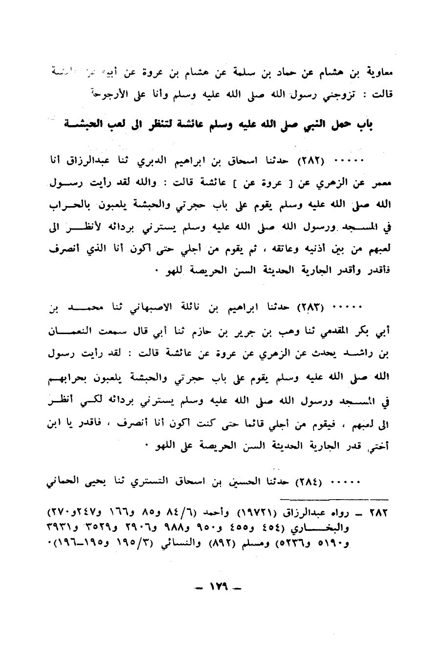 282 - حَدَّثَنَا إِسْحَاقُ بْنُ إِبْرَاهِيمَ الدَّبَرِيُّ، ثنا عَبْدُ الرَّزَّاقِ، أنا مَعْمَرٌ، عَنِ الزُّهْرِيِّ، عَنْ عُرْوَةَ، عَنْ عَائِشَةَ، قَالَتْ: «وَاللهِ §لَقَدْ رَأَيْتُ رَسُولَ اللهِ صَلَّى اللهُ عَلَيْهِ وَسَلَّمَ يَقُومُ عَلَى بَابِ حُجْرَتِي وَالْحَبَشَةُ يَلْعَبُونَ بِالْحِرَابِ فِي الْمَسْجِدِ، وَرَسُولُ اللهِ صَلَّى اللهُ عَلَيْهِ وَسَلَّمَ يَسْتُرُنِي بِرِدَائِهِ لِأَنْظُرَ إِلَى لَعِبِهِمْ مِنْ بَيْنِ أُذُنَيْهِ وَعَاتِقِهِ، ثُمَّ يَقُومُ مِنْ أَجْلِي حَتَّى أَكُونَ أَنَا الَّذِي أَنْصَرِفُ، فَاقْدُرُوا قَدْرَ الْجَارِيَةِ الْحَدِيثَةِ السِّنِّ الْحَرِيصَةِ لِلَّهْوِ»