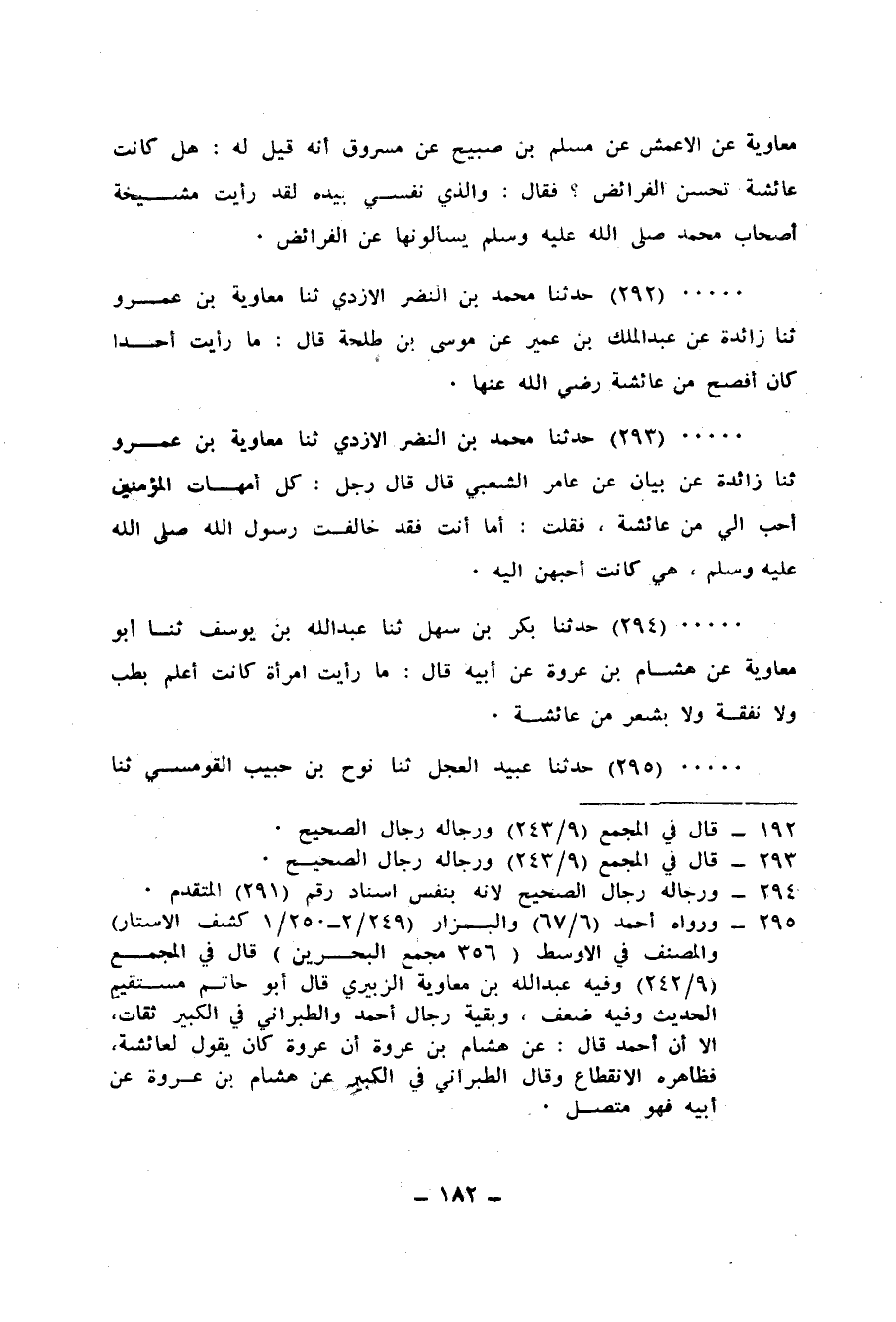 294 - حَدَّثَنَا بَكْرُ بْنُ سَهْلٍ، ثنا عَبْدُ اللهِ بْنُ يُوسُفَ، ثنا أَبُو مُعَاوِيَةَ، عَنْ هِشَامِ بْنِ عُرْوَةَ، عَنْ أَبِيهِ، قَالَ: «§مَا رَأَيْتُ امْرَأَةً كَانَتْ أَعْلَمَ بِطِبٍّ، وَلَا نَفَقَةٍ، وَلَا بِشِعْرٍ مِنْ عَائِشَةَ»
