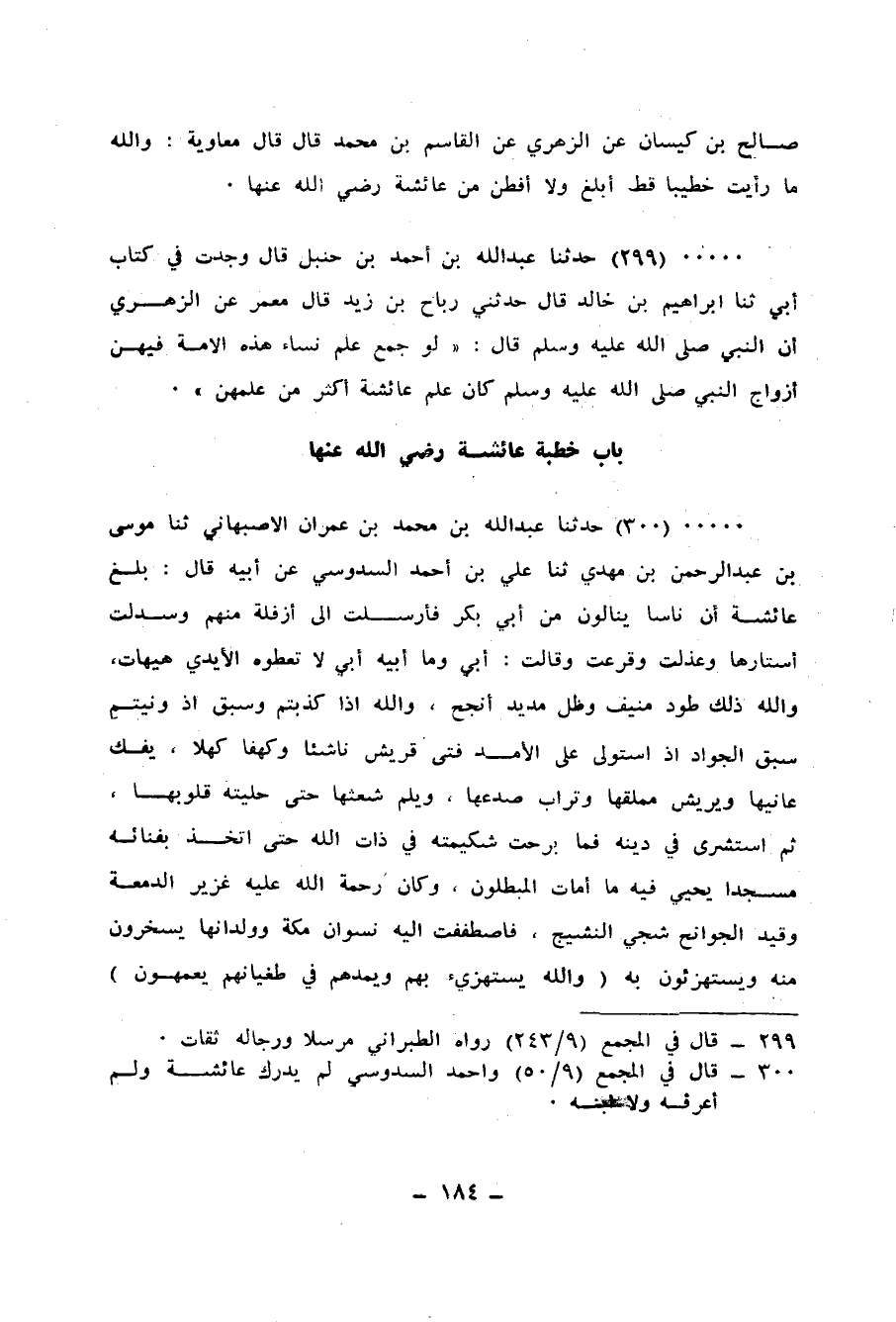 299 - حَدَّثَنَا عَبْدُ اللهِ بْنُ أَحْمَدَ بْنِ حَنْبَلٍ، قَالَ: وَجَدْتُ فِي كِتَابِ أَبِي، ثنا إِبْرَاهِيمُ بْنُ خَالِدٍ، قَالَ: حَدَّثَنِي رَبَاحُ بْنُ زَيْدٍ، قَالَ مَعْمَرٌ، عَنِ الزُّهْرِيِّ، أَنَّ النَّبِيَّ صَلَّى اللهُ عَلَيْهِ وَسَلَّمَ قَالَ: «§لَوْ جُمِعَ عِلْمُ نِسَاءِ هَذِهِ الْأُمَّةِ فِيهِنَّ أَزْوَاجُ النَّبِيِّ صَلَّى اللهُ عَلَيْهِ وَسَلَّمَ كَانَ عَلِمُ عَائِشَةَ أَكْثَرَ مِنْ عِلْمِهِنَّ»