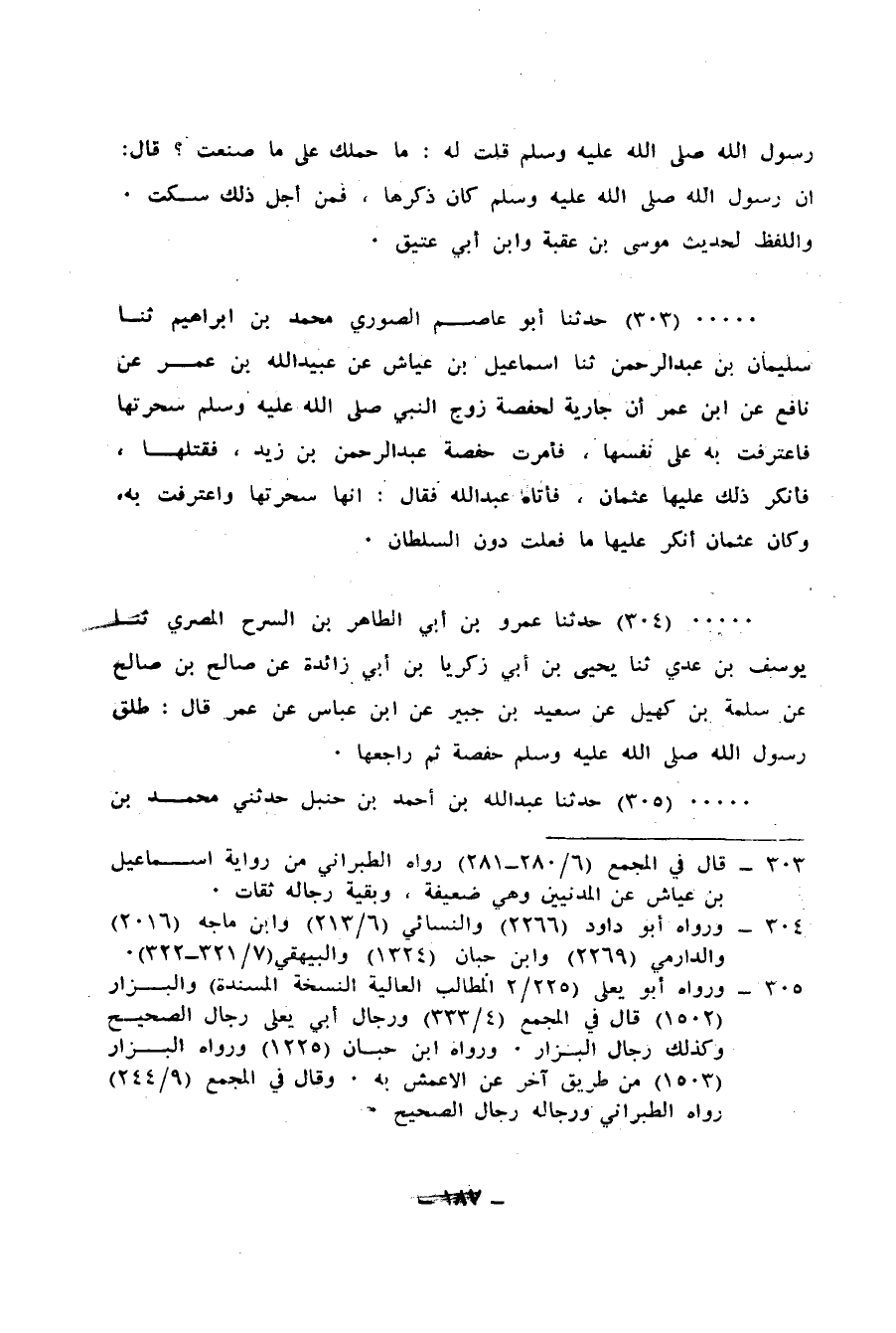303 - حَدَّثَنَا أَبُو عَاصِمٍ الصُّورِيُّ مُحَمَّدُ بْنُ إِبْرَاهِيمَ، ثنا سُلَيْمَانُ بْنُ عَبْدِ الرَّحْمَنِ، ثنا إِسْمَاعِيلُ بْنُ عَيَّاشٍ، عَنْ عُبَيْدِ اللهِ بْنِ عُمَرَ، عَنْ نَافِعٍ، عَنِ ابْنِ عُمَرَ، " أَنَّ §جَارِيَةً لِحَفْصَةَ زَوْجِ النَّبِيِّ صَلَّى اللهُ عَلَيْهِ وَسَلَّمَ سَحَرَتْهَا فَاعْتَرَفَتْ بِهِ عَلَى نَفْسِهَا، فَأَمَرَتْ حَفْصَةُ عَبْدَ الرَّحْمَنِ بْنَ زَيْدٍ، فَقَتَلَهَا، فَأَنْكَرَ ذَلِكَ عَلَيْهَا عُثْمَانُ، فَأَتَاهُ عَبْدُ اللهِ، فَقَالَ: إِنَّهَا سَحَرَتْهَا وَاعْتَرَفَتْ بِهِ، وَكَانَ عُثْمَانُ أَنْكَرَ عَلَيْهَا مَا فَعَلَتْ دُونَ السُّلْطَانِ "
