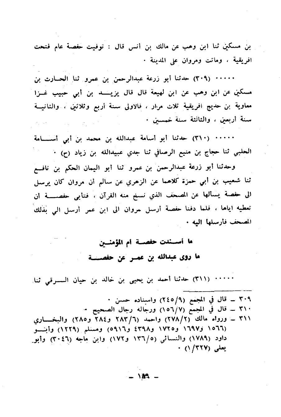 310 - حَدَّثَنَا أَبُو أُسَامَةَ عَبْدُ اللهِ بْنُ مُحَمَّدِ بْنِ أَبِي أُسَامَةَ الْحَلَبِيُّ، ثنا حَجَّاجُ بْنُ مَنِيعٍ الرُّصَافِيُّ، ثنا جَدِّي عُبَيْدُ اللهِ بْنُ زِيَادٍ، ح وَحَدَّثَنَا أَبُو زُرْعَةَ عَبْدُ الرَّحْمَنِ بْنُ عَمْرٍو، ثنا أَبُو الْيَمَانِ الْحَكَمُ بْنُ نَافِعٍ، ثنا شُعَيْبُ بْنُ أَبِي حَمْزَةَ، كِلَاهُمَا، عَنِ الزُّهْرِيِّ، عَنْ سَالِمٍ، أَنَّ مَرْوَانَ، «كَانَ §يُرْسِلُ إِلَى حَفْصَةَ يَسْأَلُهَا عَنِ الْمُصْحَفِ الَّذِي نُسِخَ مِنْهُ الْقُرْآنُ، فَتَأْبَى حَفْصَةُ أَنْ تُعْطِيَهُ إِيَّاهُ، فَلَمَّا دَفَنَّا حَفْصَةَ أَرْسَلَ مَرْوَانُ إِلَى ابْنِ عُمَرَ، أَرْسِلْ إِلَيَّ بِذَلِكَ الْمُصْحَفِ فَأَرْسَلَهَا إِلَيْهِ»