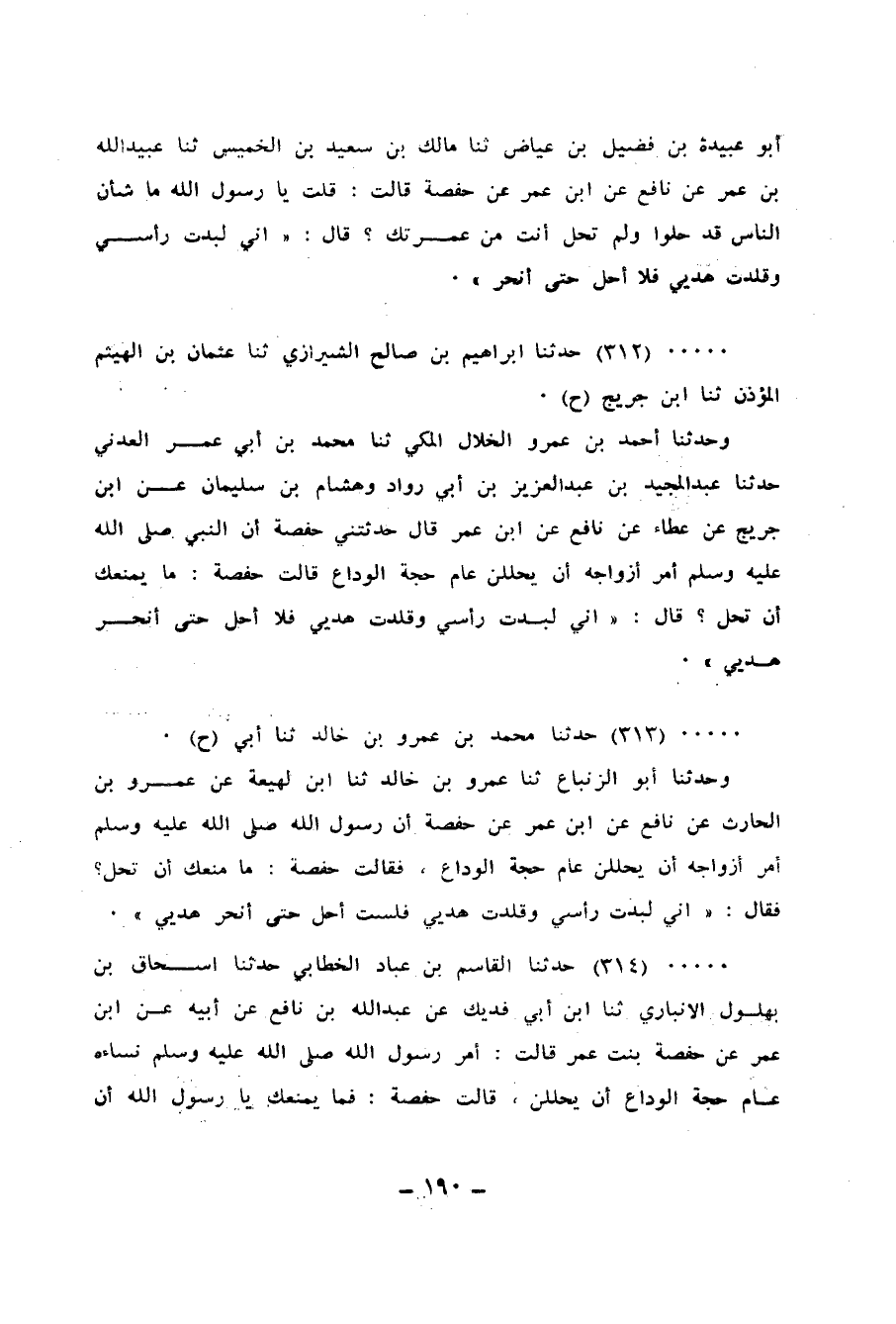 312 - حَدَّثَنَا إِبْرَاهِيمُ بْنُ صَالِحٍ الشِّيرَازِيُّ، ثنا عُثْمَانُ بْنُ الْهَيْثَمِ الْمُؤَذِّنُ، ثنا ابْنُ جُرَيْجٍ، ح وَحَدَّثَنَا أَحْمَدُ بْنُ عَمْرٍو الْخَلَّالُ الْمَكِّيُّ، ثنا مُحَمَّدُ بْنُ أَبِي عُمَرَ الْعَدَنِيُّ، حَدَّثَنَا عَبْدُ الْمَجِيدِ بْنُ عَبْدِ الْعَزِيزِ بْنِ أَبِي رَوَّادٍ، وَهِشَامُ بْنُ سُلَيْمَانَ، عَنِ ابْنِ جُرَيْجٍ، عَنْ عَطَاءٍ، عَنْ نَافِعٍ، عَنِ ابْنِ عُمَرَ، قَالَ: حَدَّثَتْنِي حَفْصَةُ، أَنَّ النَّبِيَّ صَلَّى اللهُ عَلَيْهِ وَسَلَّمَ أَمَرَ أَزْوَاجَهُ أَنْ يُحْلِلْنَ عَامَ حَجَّةِ الْوَدَاعِ، قَالَتْ حَفْصَةُ: مَا يَمْنَعُكَ أَنْ تُحِلَّ؟، قَالَ: «§إِنِّي لَبَّدْتُ رَأْسِي وَقَلَّدْتُ هَدْيِي فَلَا أُحِلُّ حَتَّى أَنْحَرَ هَدْيِي»