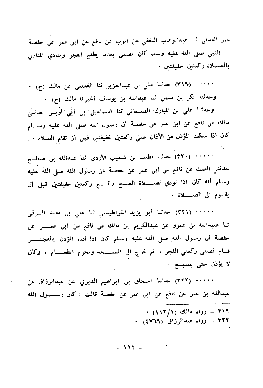 319 - حَدَّثَنَا عَلِيُّ بْنُ عَبْدِ الْعَزِيزِ، ثنا الْقَعْنَبِيُّ، عَنْ مَالِكٍ، ح وَحَدَّثَنَا بَكْرُ بْنُ سَهْلٍ، ثنا عَبْدُ اللهِ بْنُ يُوسُفَ، أَخْبَرَنَا مَالِكٌ، ح وَحَدَّثَنَا عَلِيُّ بْنُ الْمُبَارَكِ الصَّنْعَانِيُّ، ثنا إِسْمَاعِيلُ بْنُ أَبِي أُوَيْسٍ، حَدَّثَنِي مَالِكٌ، عَنْ نَافِعٍ، عَنِ ابْنِ عُمَرَ، عَنْ حَفْصَةَ، «أَنَّ رَسُولَ اللهِ صَلَّى اللهُ عَلَيْهِ وَسَلَّمَ كَانَ §إِذَا سَكَتَ الْمُؤَذِّنُ مِنَ الْأَذَانِ، صَلَّى رَكْعَتَيْنِ خَفِيفَتَيْنِ قَبْلَ أَنْ تُقَامَ الصَّلَاةُ»