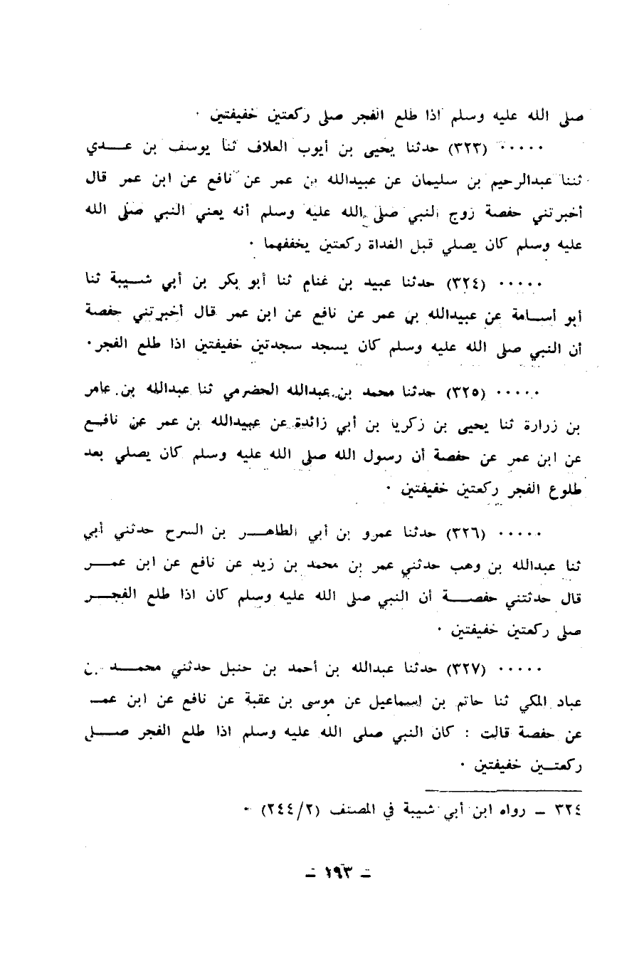 324 - حَدَّثَنَا عُبَيْدُ بْنُ غَنَّامٍ، ثنا أَبُو بَكْرِ بْنِ أَبِي شَيْبَةَ، ثنا أَبُو أُسَامَةَ، عَنْ عُبَيْدِ اللهِ بْنِ عُمَرَ، عَنْ نَافِعٍ، عَنِ ابْنِ عُمَرَ، قَالَ: أَخْبَرَتْنِي حَفْصَةُ، أَنَّ النَّبِيَّ صَلَّى اللهُ عَلَيْهِ وَسَلَّمَ كَانَ: «§يَسْجُدُ سَجْدَتَيْنِ خَفِيفَتَيْنِ إِذَا طَلَعَ الْفَجْرُ»