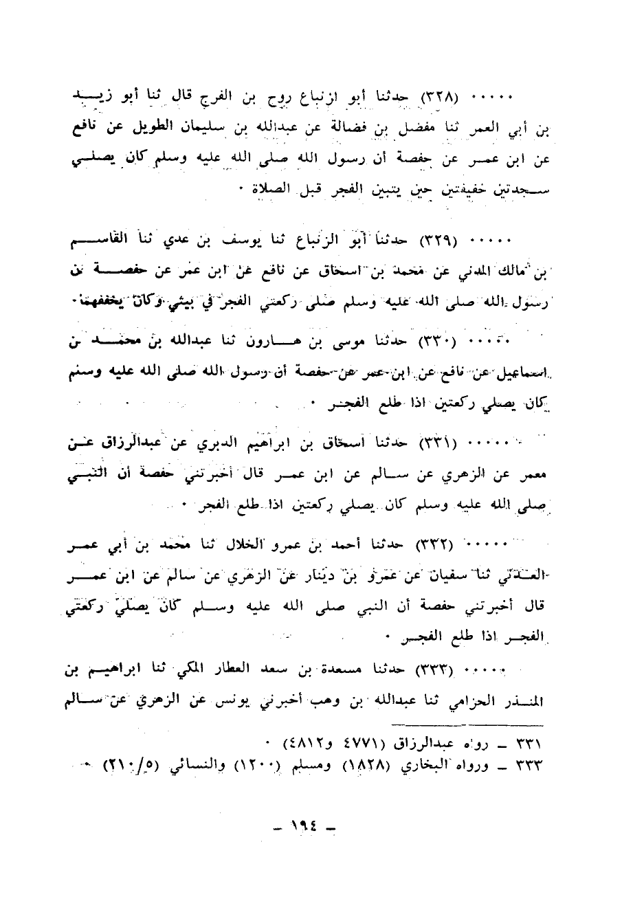 331 - حَدَّثَنَا إِسْحَاقُ بْنُ إِبْرَاهِيمَ الدَّبَرِيُّ، عَنْ عَبْدِ الرَّزَّاقِ، عَنْ مَعْمَرٍ، عَنِ الزُّهْرِيِّ، عَنْ سَالِمٍ، عَنِ ابْنِ عُمَرَ، قَالَ: أَخْبَرَتْنِي حَفْصَةُ، أَنَّ النَّبِيَّ صَلَّى اللهُ عَلَيْهِ وَسَلَّمَ كَانَ: «§يُصَلِّي رَكْعَتَيْنِ إِذَا طَلَعَ الْفَجْرُ»