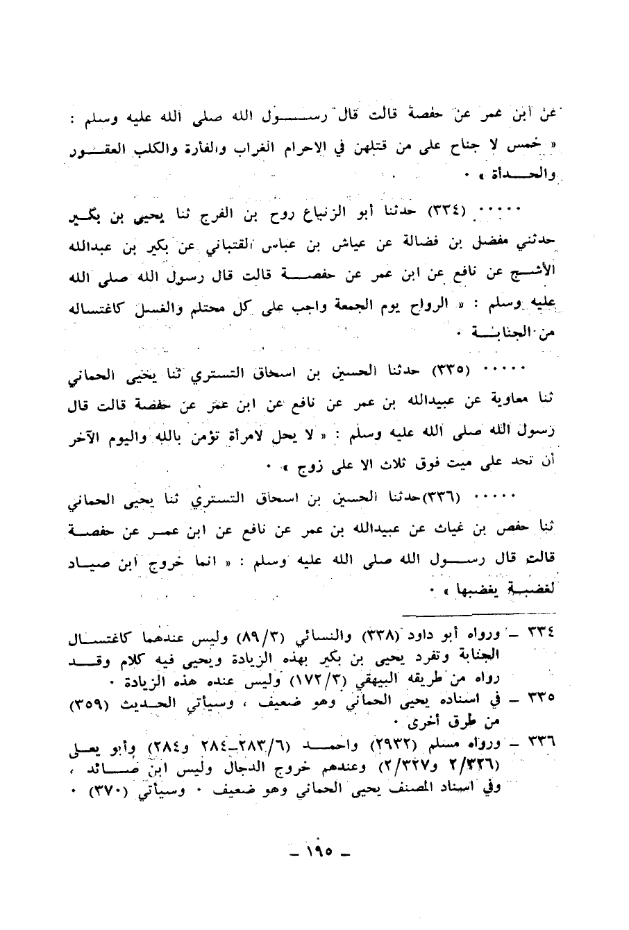 335 - حَدَّثَنَا الْحُسَيْنُ بْنُ إِسْحَاقَ التُّسْتَرِيُّ، ثنا يَحْيَى الْحِمَّانِيُّ، ثنا مُعَاوِيَةُ، عَنْ عُبَيْدِ اللهِ بْنِ عُمَرَ، عَنْ نَافِعٍ، عَنِ ابْنِ عُمَرَ، عَنْ حَفْصَةَ، قَالَتْ: قَالَ رَسُولُ اللهِ صَلَّى اللهُ عَلَيْهِ وَسَلَّمَ: «§لَا يَحِلُّ لِامْرَأَةٍ تُؤْمِنُ بِاللهِ وَالْيَوْمِ الْآخِرِ أَنْ تُحِدَّ عَلَى مَيِّتٍ فَوْقَ ثَلَاثٍ إِلَّا عَلَى زَوْجٍ»