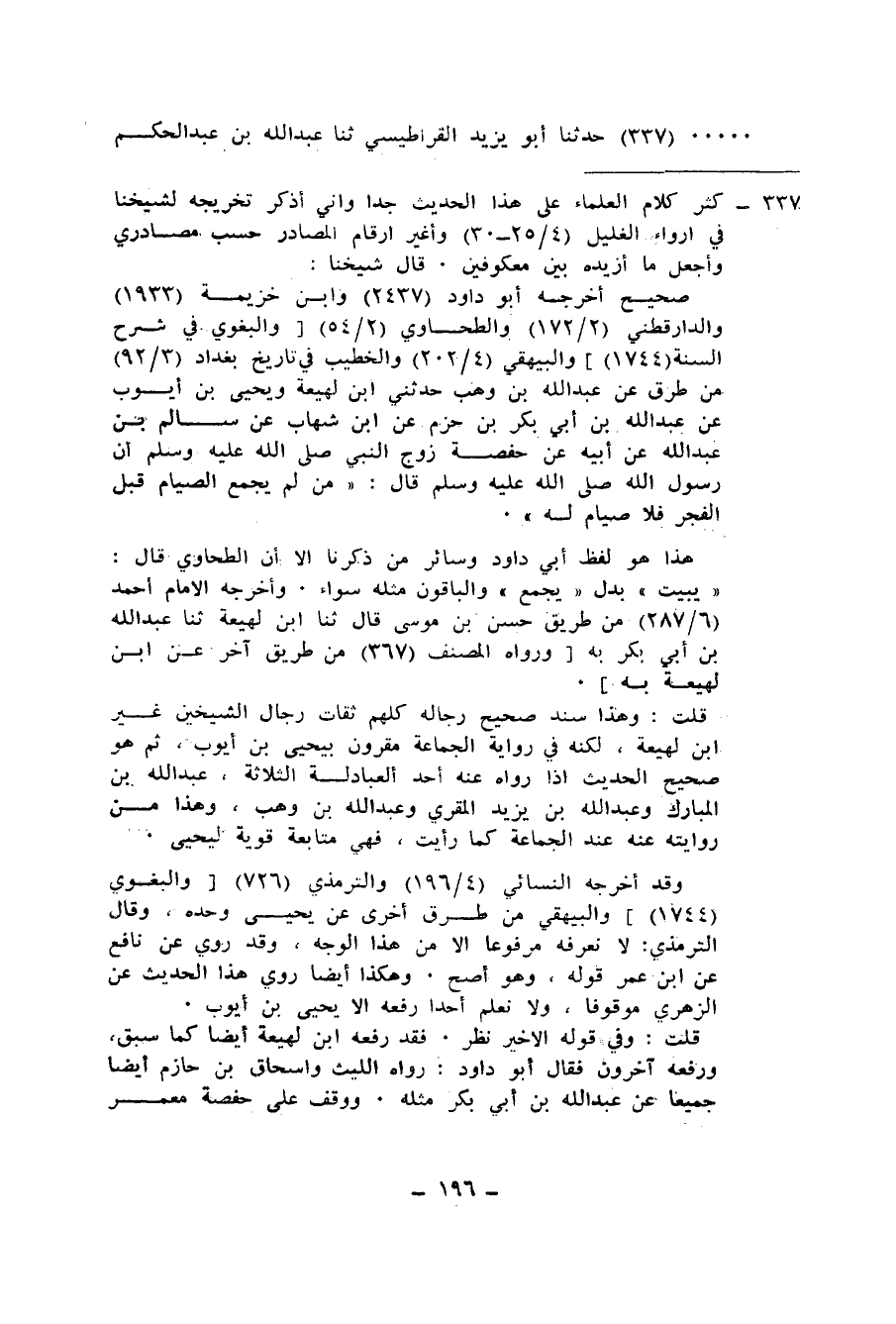 337 - حَدَّثَنَا أَبُو يَزِيدَ الْقَرَاطِيسِيُّ، ثنا عَبْدُ اللهِ بْنُ عَبْدِ الْحَكَمِ -[197]-، أنا اللَّيْثُ بْنُ سَعْدٍ، وَيَحْيَى بْنُ أَيُّوبَ، عَنْ عَبْدِ اللهِ بْنِ أَبِي بَكْرٍ، عَنِ ابْنِ شِهَابٍ -[198]-، عَنْ سَالِمٍ، عَنْ أَبِيهِ، عَنْ حَفْصَةَ، عَنِ النَّبِيِّ صَلَّى اللهُ عَلَيْهِ وَسَلَّمَ: «§مَنْ لَمْ -[199]- يُجْمِعِ الصِّيَامَ قَبْلَ الْفَجْرِ فَلَا صِيَامَ لَهُ»