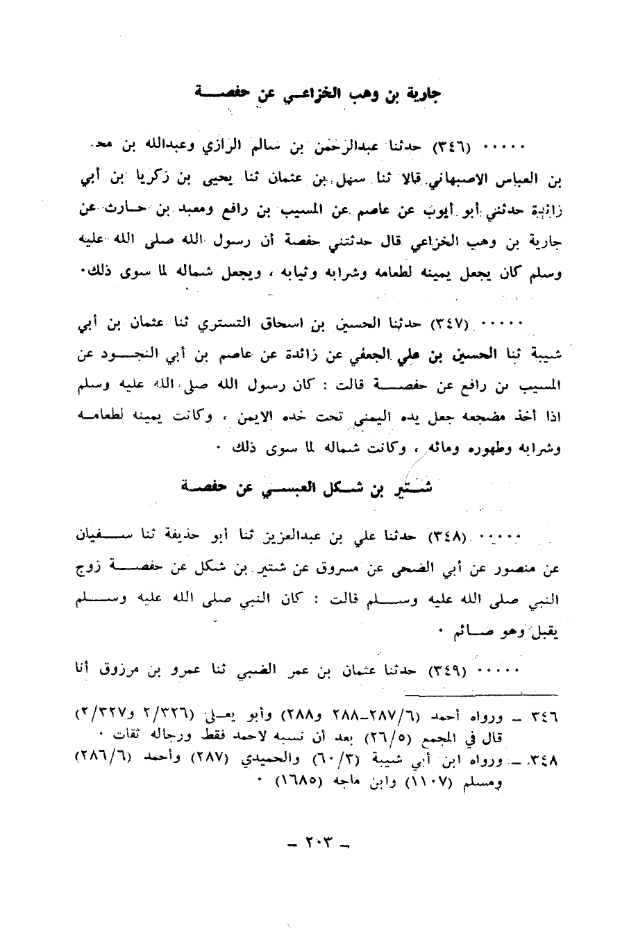 346 - حَدَّثَنَا عَبْدُ الرَّحْمَنِ بْنُ سَالِمٍ الرَّازِيُّ، وَعَبْدُ اللهِ بْنُ مُحَمَّدِ بْنِ الْعَبَّاسِ الْأَصْبَهَانِيُّ، قَالَا: ثنا سَهْلُ بْنُ عُثْمَانَ، ثنا يَحْيَى بْنُ زَكَرِيَّا بْنِ أَبِي زَائِدَةَ، حَدَّثَنِي أَبُو أَيُّوبَ، عَنْ عَاصِمٍ، عَنِ الْمُسَيَّبِ بْنِ رَافِعٍ، وَمَعْبَدِ بْنِ حَارِثٍ، عَنْ جَارِيَةَ بْنِ وَهْبٍ الْخُزَاعِيِّ، قَالَ: حَدَّثَتْنِي حَفْصَةُ، أَنَّ رَسُولَ اللهِ صَلَّى اللهُ عَلَيْهِ وَسَلَّمَ كَانَ: «§يَجْعَلُ يَمِينَهُ لِطَعَامِهِ وَشَرَابِهِ وَثِيَابِهِ، وَيَجْعَلُ شِمَالَهُ لِمَا سِوَى ذَلِكَ»