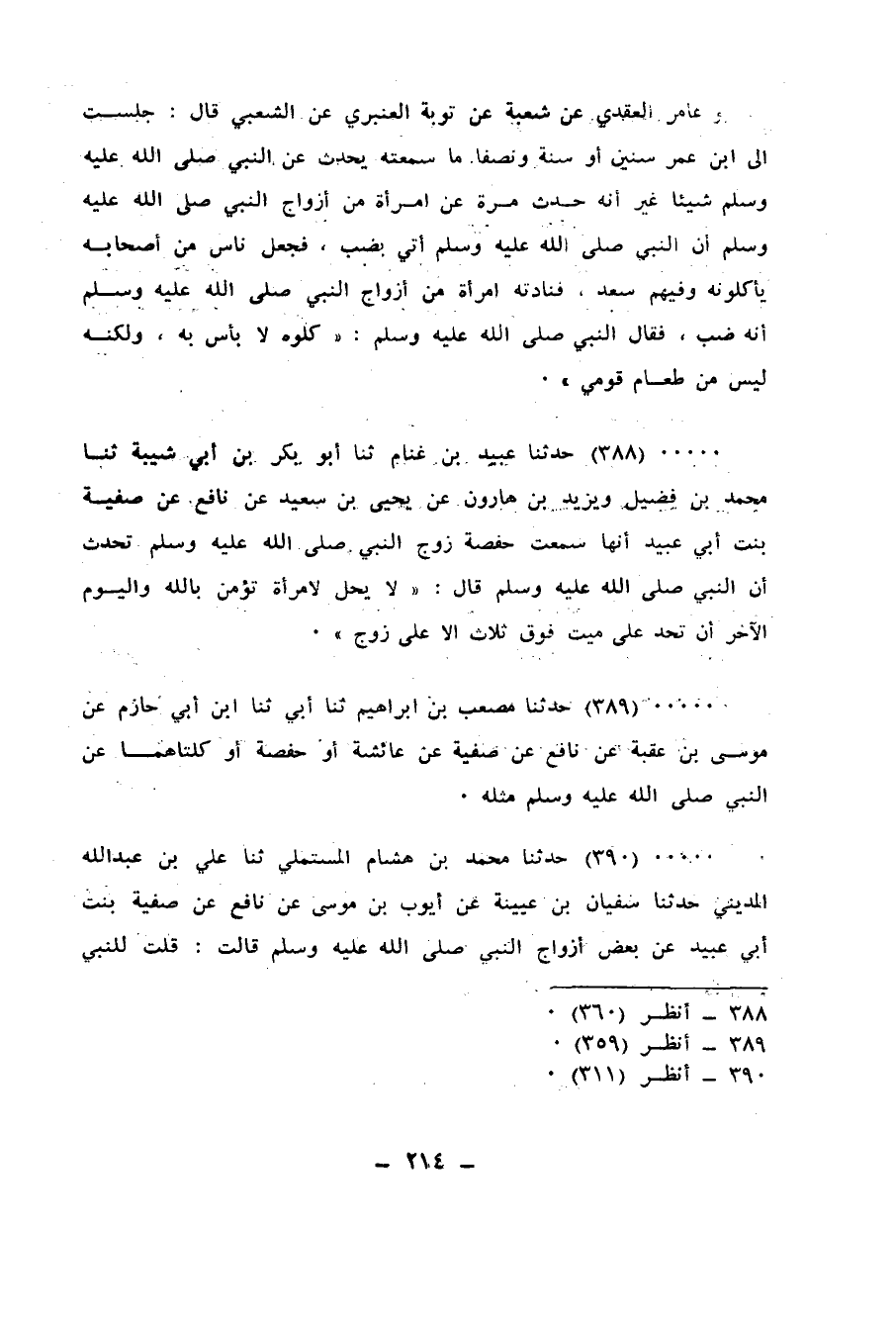 388 - حَدَّثَنَا عُبَيْدُ بْنُ غَنَّامٍ، ثنا أَبُو بَكْرِ بْنُ أَبِي شَيْبَةَ، ثنا مُحَمَّدُ بْنُ فُضَيْلٍ، وَيَزِيدُ بْنُ هَارُونَ، عَنْ يَحْيَى بْنِ سَعِيدٍ، عَنْ نَافِعٍ، عَنْ صَفِيَّةَ بِنْتِ أَبِي عُبَيْدٍ، أَنَّهَا سَمِعَتْ حَفْصَةَ - زَوْجَ النَّبِيِّ صَلَّى اللهُ عَلَيْهِ وَسَلَّمَ - تُحَدِّثُ، أَنَّ النَّبِيَّ صَلَّى اللهُ عَلَيْهِ وَسَلَّمَ قَالَ: «§لَا يَحِلُّ لِامْرَأَةٍ تُؤْمِنُ بِاللهِ وَالْيَوْمِ الْآخِرِ أَنْ تُحِدَّ عَلَى مَيِّتٍ فَوْقَ ثَلَاثٍ إِلَّا عَلَى زَوْجٍ» .