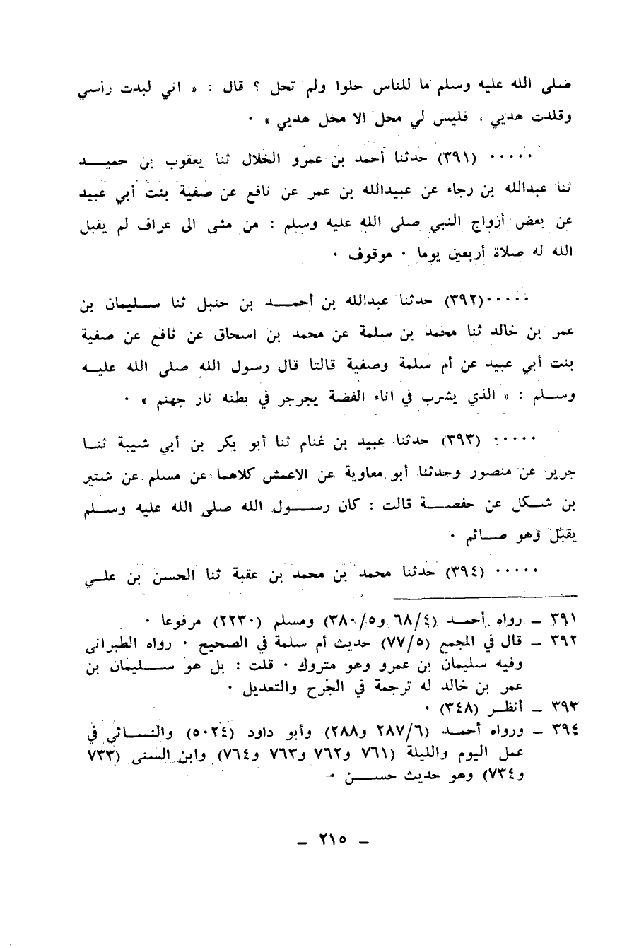 392 - حَدَّثَنَا عَبْدُ اللهِ بْنُ أَحْمَدَ بْنِ حَنْبَلٍ، ثنا سُلَيْمَانُ بْنُ عُمَرَ بْنِ خَالِدٍ، ثنا مُحَمَّدُ بْنُ سَلَمَةَ، عَنْ مُحَمَّدِ بْنِ إِسْحَاقَ، عَنْ نَافِعٍ، عَنْ صَفِيَّةَ بِنْتِ أَبِي عُبَيْدٍ، عَنْ أُمِّ سَلَمَةَ، وَصَفِيَّةَ، قَالَتَا: قَالَ رَسُولُ اللهِ صَلَّى اللهُ عَلَيْهِ وَسَلَّمَ: «§الَّذِي يَشْرَبُ فِي إِنَاءِ الْفِضَّةِ يُجَرْجِرُ فِي بَطْنِهِ نَارَ جَهَنَّمَ»