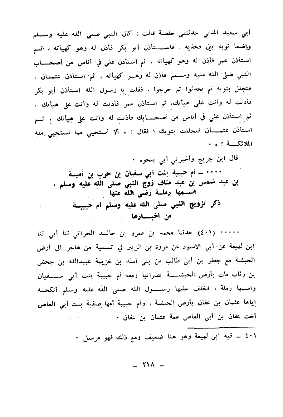 401 - حَدَّثَنَا مُحَمَّدُ بْنُ عَمْرِو بْنِ خَالِدٍ الْحَرَّانِيُّ، ثنا أَبِي، ثنا ابْنُ لَهِيعَةَ، عَنْ أَبِي الْأَسْوَدِ، عَنْ عُرْوَةَ بْنِ الزُّبَيْرِ، فِي «§تَسْمِيَةِ مَنْ هَاجَرَ إِلَى أَرْضِ الْحَبَشَةِ مَعَ جَعْفَرِ بْنِ أَبِي طَالِبٍ مِنْ بَنِي أَسَدِ بْنِ خُزَيْمَةَ عُبَيْدُ اللهِ بْنُ جَحْشِ بْنِ رِئَابٍ، مَاتَ بِأَرْضِ الْحَبَشَةِ نَصْرَانِيًّا وَمَعَهُ أُمُّ حَبِيبَةَ بِنْتُ أَبِي سُفْيَانَ، وَاسْمُهَا رَمْلَةُ، فَخَلَّفَ عَلَيْهَا رَسُولُ اللهِ صَلَّى اللهُ عَلَيْهِ وَسَلَّمَ، أَنْكَحَهُ إِيَّاهَا عُثْمَانُ بْنُ عَفَّانَ بِأَرْضِ الْحَبَشَةِ، وَأُمُّ حَبِيبَةَ أُمُّهَا صَفِيَّةُ بِنْتُ أَبِي الْعَاصِ، أُخْتُ عَفَّانَ بْنِ أَبِي الْعَاصِ، عَمَّةُ عُثْمَانَ بْنِ عَفَّانَ»
