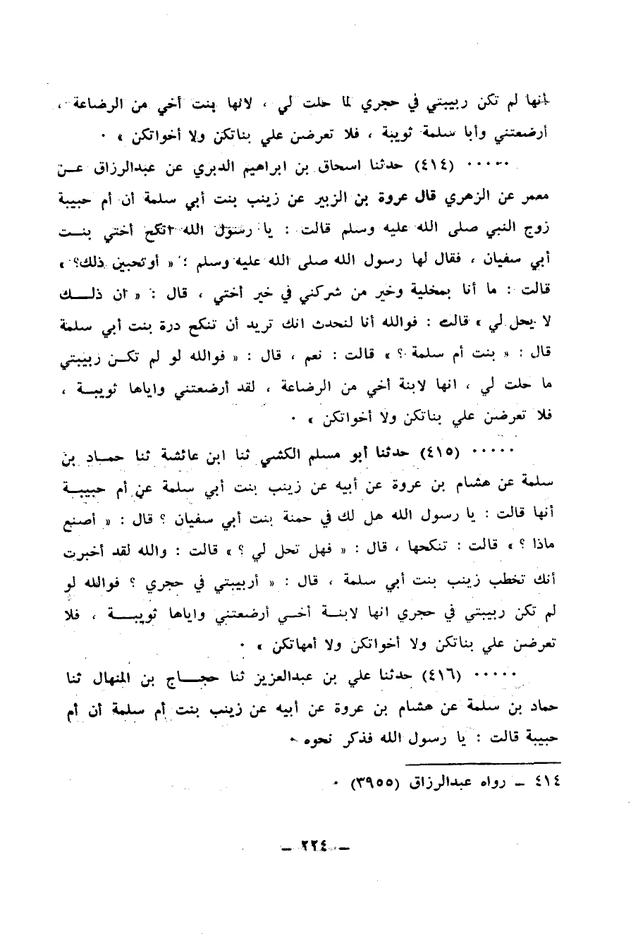 415 - حَدَّثَنَا أَبُو مُسْلِمٍ الْكَشِّيُّ، ثنا ابْنُ عَائِشَةَ، ثنا حَمَّادُ بْنُ سَلَمَةَ، عَنْ هِشَامِ بْنِ عُرْوَةَ، عَنْ أَبِيهِ، عَنْ زَيْنَبَ بِنْتِ أَبِي سَلَمَةَ، عَنْ أُمِّ حَبِيبَةَ، أَنَّهَا قَالَتْ: يَا رَسُولَ اللهِ هَلْ لَكَ فِي حَمْنَةَ بِنْتِ أَبِي سُفْيَانَ، قَالَ: «أَصْنَعُ مَاذَا؟» ، قَالَتْ: تَنْكِحُهَا، قَالَ: «فَهَلْ تَحِلُّ لِي؟» ، قَالَتْ: وَاللهِ لَقَدْ أُخْبِرْتُ أَنَّكَ تَخْطُبُ زَيْنَبَ بِنْتَ أَبِي سَلَمَةَ، قَالَ: «أَرَبِيبَتِي فِي حِجْرِي فَوَاللهِ لَوْ لَمْ تَكُنْ رَبِيبَتِي فِي حِجْرِي إِنَّهَا لَابْنَةُ أَخِي، أَرْضَعَتْنِي وَإِيَّاهَا ثُوَيْبَةُ، §فَلَا تَعْرِضْنَ عَلَيَّ بَنَاتِكُنَّ وَلَا أَخَوَاتِكُنَّ وَلَا أُمَّهَاتِكُنَّ» .
