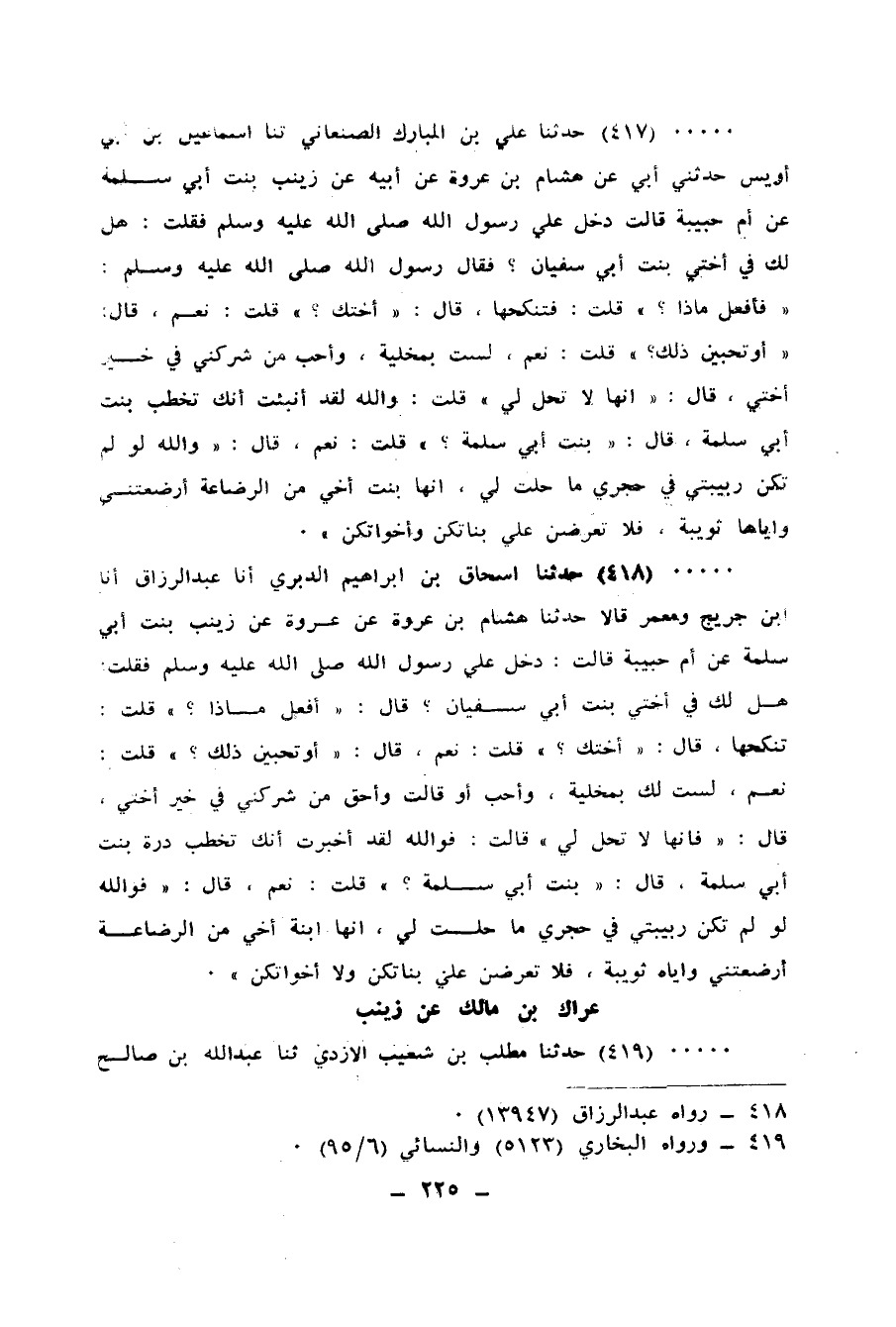 418 - حَدَّثَنَا إِسْحَاقُ بْنُ إِبْرَاهِيمَ الدَّبَرِيُّ، أنا عَبْدُ الرَّزَّاقِ، أنا ابْنُ جُرَيْجٍ، وَمَعْمَرٌ، قَالَا: حَدَّثَنَا هِشَامُ بْنُ عُرْوَةَ، عَنْ عُرْوَةَ، عَنْ زَيْنَبَ بِنْتِ أَبِي سَلَمَةَ، عَنْ أُمِّ حَبِيبَةَ، قَالَتْ: دَخَلَ عَلَيَّ رَسُولُ اللهِ صَلَّى اللهُ عَلَيْهِ وَسَلَّمَ، فَقُلْتُ: هَلْ لَكَ فِي أُخْتِي بِنْتِ أَبِي سُفْيَانَ؟، قَالَ: «أَفْعَلُ مَاذَا؟» ، قُلْتُ: تَنْكِحُهَا، قَالَ: «أُخْتَكِ؟» ، قُلْتُ: نَعَمْ، قَالَ: «أَوَ تُحِبِّينَ ذَلِكَ؟» ، قُلْتُ: نَعَمْ، لَسْتُ لَكَ بِمُخْلِيَةٍ وَأَحَبُّ - أَوْ قَالَتْ: - وَأَحَقُّ مَنْ شَرِكَنِي فِي خَيْرٍ أُخْتِي، قَالَ: «فَإِنَّهَا لَا تَحِلُّ لِي» ، قَالَتْ: فَوَاللهِ لَقَدْ أُخْبِرْتُ أَنَّكَ تَخْطُبُ دُرَّةَ بِنْتَ أَبِي سَلَمَةَ، قَالَ: «بِنْتَ أَبِي سَلَمَةَ؟» ، قُلْتُ: نَعَمْ، قَالَ: «فَوَاللهِ §لَوْ لَمْ تَكُنْ رَبِيبَتِي فِي حِجْرِي مَا حَلَّتْ لِي إِنَّهَا ابْنَةُ أَخِي مِنَ الرَّضَاعَةِ، أَرْضَعَتْنِي وَإِيَّاهَا ثُوَيْبَةُ، فَلَا تَعْرِضْنَ عَلَيَّ بَنَاتِكُنَّ وَلَا أَخَوَاتِكُنَّ»
