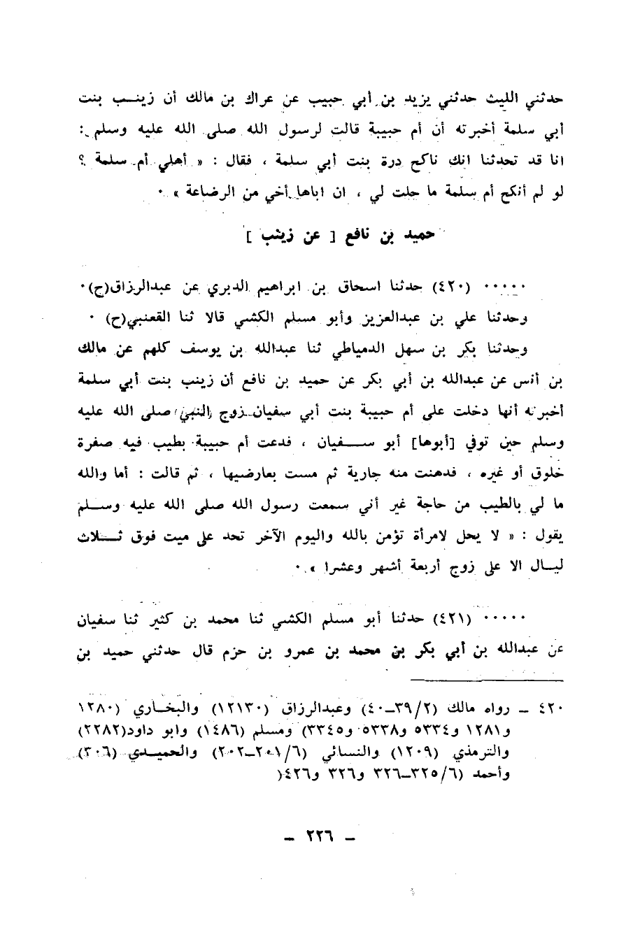 420 - حَدَّثَنَا إِسْحَاقُ بْنُ إِبْرَاهِيمَ الدَّبَرِيُّ، عَنْ عَبْدِ الرَّزَّاقِ، ح وَحَدَّثَنَا عَلِيُّ بْنُ عَبْدِ الْعَزِيزِ، وَأَبُو مُسْلِمٍ الْكَشِّيُّ، قَالَا: ثنا الْقَعْنَبِيُّ، ح وَحَدَّثَنَا بَكْرُ بْنُ سَهْلٍ الدِّمْيَاطِيُّ، ثنا عَبْدُ اللهِ بْنُ يُوسُفَ، كُلُّهُمْ عَنْ مَالِكِ بْنِ أَنَسٍ، عَنْ عَبْدِ اللهِ بْنِ أَبِي بَكْرٍ، عَنْ حُمَيْدِ بْنِ نَافِعٍ، أَنَّ زَيْنَبَ بِنْتَ أَبِي سَلَمَةَ أَخْبَرَتْهُ، أَنَّهَا دَخَلَتْ عَلَى أُمِّ حَبِيبَةَ بِنْتِ أَبِي سُفْيَانَ - زَوْجِ النَّبِيِّ صَلَّى اللهُ عَلَيْهِ وَسَلَّمَ - حِينَ تُوُفِّيَ أَبُوهَا أَبُو سُفْيَانَ، فَدَعَتْ أُمُّ حَبِيبَةَ بِطِيبٍ فِيهِ صُفْرَةٌ خَلُوقٌ أَوْ غَيْرُهُ، فَدَهَنَتْ مِنْهُ جَارِيَةً، ثُمَّ مَسَّتْ بِعَارِضَيْهَا، ثُمَّ قَالَتْ: أَمَا وَاللهِ مَا لِي بِالطِّيبِ مِنْ حَاجَةٍ غَيْرَ أَنِّي سَمِعْتُ رَسُولَ اللهِ صَلَّى اللهُ عَلَيْهِ وَسَلَّمَ يَقُولُ: «§لَا يَحِلُّ لِامْرَأَةٍ تُؤْمِنُ بِاللهِ وَالْيَوْمِ الْآخِرِ تُحِدُّ عَلَى مَيِّتٍ فَوْقَ ثَلَاثِ لَيَالٍ إِلَّا عَلَى زَوْجٍ أَرْبَعَةَ أَشْهُرٍ وَعَشْرًا»
