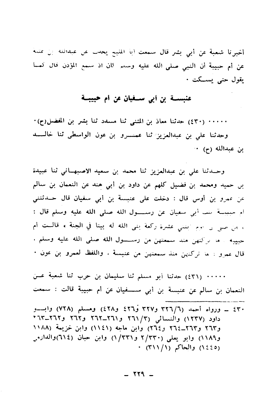 430 - حَدَّثَنَا مُعَاذُ بْنُ الْمُثَنَّى، ثنا مُسَدَّدٌ، ثنا بِشْرُ بْنُ الْمُفَضَّلِ، ح وَحَدَّثَنَا عَلِيُّ بْنُ عَبْدِ الْعَزِيزِ، ثنا عَمْرُو بْنُ عَوْنٍ الْوَاسِطِيُّ، ثنا خَالِدُ بْنُ عَبْدِ اللهِ، ح وَحَدَّثَنَا عَلِيُّ بْنُ عَبْدِ الْعَزِيزِ، ثنا مُحَمَّدُ بْنُ سَعِيدٍ الْأَصْبَهَانِيُّ، ثنا عَبِيدَةُ بْنُ حُمَيْدٍ، وَمُحَمَّدُ بْنُ فُضَيْلٍ، كُلُّهُمْ عَنْ دَاوُدَ بْنِ أَبِي هِنْدَ، عَنِ النُّعْمَانِ بْنِ سَالِمٍ، عَنْ عَمْرِو بْنِ أَوْسٍ، قَالَ: دَخَلْتُ عَلَى عَنْبَسَةَ بْنِ أَبِي سُفْيَانَ، قَالَ: حَدَّثَتْنِي أُمُّ حَبِيبَةَ بِنْتُ أَبِي سُفْيَانَ، عَنْ رَسُولِ اللهِ صَلَّى اللهُ عَلَيْهِ وَسَلَّمَ قَالَ: «§مَنْ صَلَّى فِي يَوْمٍ اثْنَتَيْ عَشْرَةَ رَكْعَةً بَنَى اللهُ لَهُ بَيْتًا فِي الْجَنَّةِ» . قَالَتْ أُمُّ حَبِيبَةَ: مَا تَرَكْتُهُنَّ مُنْذُ سَمِعْتُهُنَّ مِنْ رَسُولِ اللهِ صَلَّى اللهُ عَلَيْهِ وَسَلَّمَ. قَالَ عَمْرٌو: مَا تَرَكْتُهُنَّ مُنْذُ سَمِعْتُهُنَّ مِنْ عَنْبَسَةَ. «وَاللَّفْظُ لِعَمْرِو بْنِ عَوْنٍ»