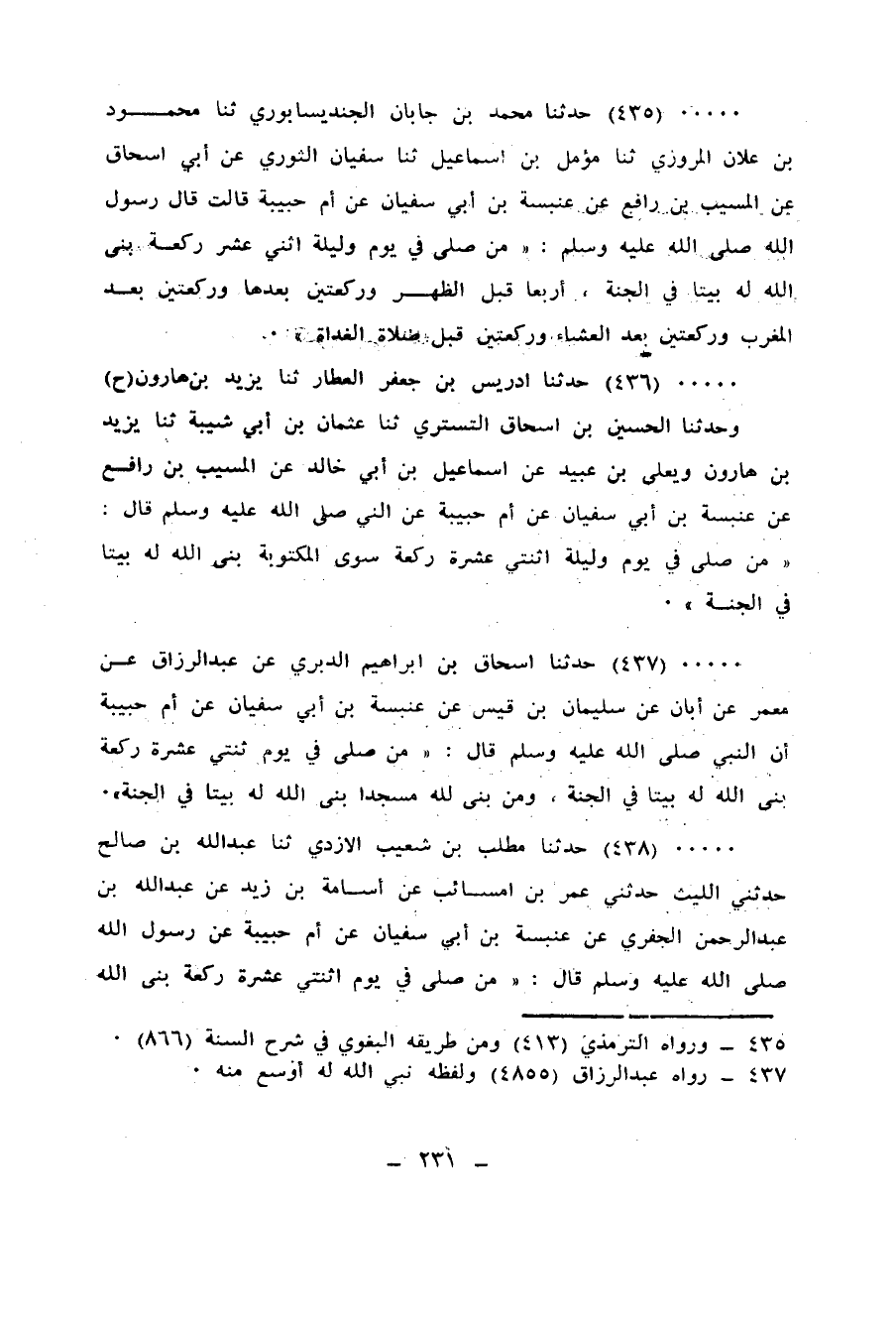 435 - حَدَّثَنَا مُحَمَّدُ بْنُ جَابَانَ الْجُنْدِيسَابُورِيُّ، ثنا مَحْمُودُ بْنُ عَلَّانَ الْمَرْوَزِيُّ، ثنا مُؤَمَّلُ بْنُ إِسْمَاعِيلَ، ثنا سُفْيَانُ الثَّوْرِيُّ، عَنْ أَبِي إِسْحَاقَ، عَنِ الْمُسَيَّبِ بْنِ رَافِعٍ، عَنْ عَنْبَسَةَ بْنِ أَبِي سُفْيَانَ، عَنْ أُمِّ حَبِيبَةَ، قَالَتْ: قَالَ رَسُولُ اللهِ صَلَّى اللهُ عَلَيْهِ وَسَلَّمَ: " §مَنْ صَلَّى فِي يَوْمٍ وَلَيْلَةٍ اثْنَتَيْ عَشْرَةَ رَكْعَةً بَنَى اللهُ لَهُ بَيْتًا فِي الْجَنَّةِ: أَرْبَعًا قَبْلَ الظُّهْرِ، وَرَكْعَتَيْنِ بَعْدَهَا، وَرَكْعَتَيْنِ بَعْدَ الْمَغْرِبِ، وَرَكْعَتَيْنِ بَعْدَ الْعِشَاءِ، وَرَكْعَتَيْنِ قَبْلَ صَلَاةِ الْغَدَاةِ "