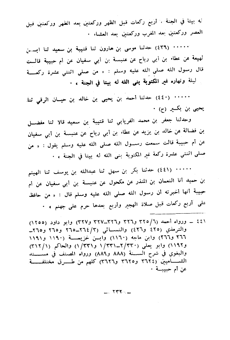 439 - حَدَّثَنَا مُوسَى بْنُ هَارُونَ، ثنا قُتَيْبَةُ بْنُ سَعِيدٍ، ثنا ابْنُ لَهِيعَةَ، عَنْ عَطَاءِ بْنِ أَبِي رَبَاحٍ، عَنْ عَنْبَسَةَ بْنِ أَبِي سُفْيَانَ، عَنْ أُمِّ حَبِيبَةَ، قَالَتْ: قَالَ رَسُولُ اللهِ صَلَّى اللهُ عَلَيْهِ وَسَلَّمَ: «§مَنْ صَلَّى اثْنَتَيْ عَشْرَةَ رَكْعَةً فِي لَيْلَهِ وَنَهَارَهِ غَيْرَ الْمَكْتُوبَةِ بَنَى اللهُ لَهُ بَيْتًا فِي الْجَنَّةِ»