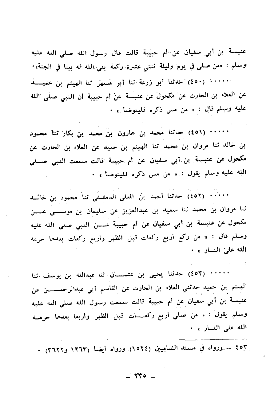 451 - حَدَّثَنَا مُحَمَّدُ بْنُ هَارُونَ بْنِ مُحَمَّدِ بْنِ بَكَّارٍ، ثنا مَحْمُودُ بْنُ خَالِدٍ، ثنا مَرْوَانُ بْنُ مُحَمَّدٍ، ثنا الْهَيْثَمُ بْنُ حُمَيْدٍ، عَنِ الْعَلَاءِ بْنِ الْحَارِثِ، عَنْ مَكْحُولٍ، عَنْ عَنْبَسَةَ بْنِ أَبِي سُفْيَانَ، عَنْ أُمِّ حَبِيبَةَ، قَالَتْ: سَمِعْتُ النَّبِيَّ صَلَّى اللهُ عَلَيْهِ وَسَلَّمَ يَقُولُ: «§مَنْ مَسَّ ذَكَرَهُ فَلْيَتَوَضَّأْ»