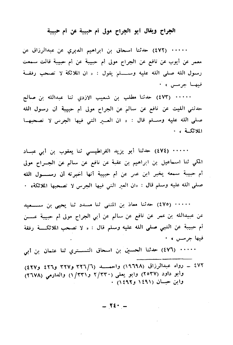 475 - حَدَّثَنَا مُعَاذُ بْنُ الْمُثَنَّى، ثنا مُسَدَّدٌ، ثنا يَحْيَى بْنُ سَعِيدٍ، عَنْ عُبَيْدِ اللهِ بْنِ عُمَرَ، عَنْ نَافِعٍ، عَنْ سَالِمٍ، عَنْ أَبِي الْجَرَّاحِ، مَوْلَى أُمِّ حَبِيبَةَ، عَنْ أُمِّ حَبِيبَةَ، عَنِ النَّبِيِّ صَلَّى اللهُ عَلَيْهِ وَسَلَّمَ قَالَ: «§لَا تَصْحَبُ الْمَلَائِكَةُ رُفْقَةً فِيهَا جَرَسٌ»
