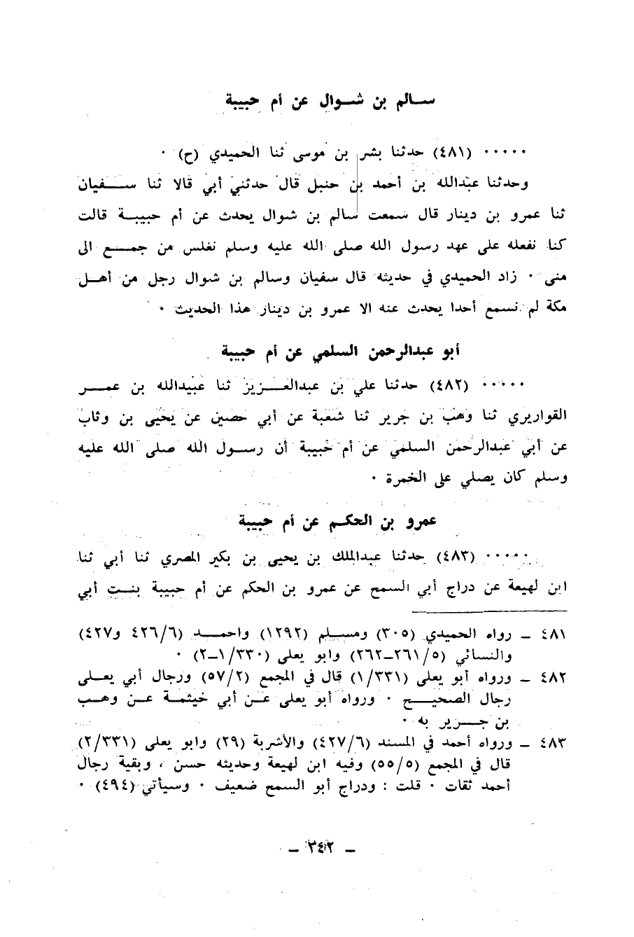 481 - حَدَّثَنَا بِشْرُ بْنُ مُوسَى، ثنا الْحُمَيْدِيُّ، ح وَحَدَّثَنَا عَبْدُ اللهِ بْنُ أَحْمَدَ بْنِ حَنْبَلٍ، قَالَ: حَدَّثَنِي أَبِي، قَالَا: ثنا سُفْيَانُ، ثنا عَمْرُو بْنُ دِينَارٍ، قَالَ: سَمِعْتُ سَالِمَ بْنَ شَوَّالٍ يُحَدِّثُ، عَنْ أُمِّ حَبِيبَةَ، قَالَتْ: «كُنَّا نَفْعَلُهُ عَلَى عَهْدِ رَسُولِ اللهِ صَلَّى اللهُ عَلَيْهِ وَسَلَّمَ §نُغَلِّسُ مِنْ جَمْعٍ إِلَى مِنًى» . زَادَ الْحُمَيْدِيُّ فِي حَدِيثِهِ، قَالَ سُفْيَانُ: وَسَالِمُ بْنُ شَوَّالٍ رَجُلٌ مِنْ أَهْلِ مَكَّةَ لَمْ نَسْمَعْ أَحَدًا يُحَدِّثُ عَنْهُ إِلَّا عَمْرَو بْنَ دِينَارٍ هَذَا الْحَدِيثَ