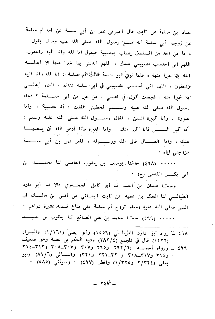 498 - حَدَّثَنَا يُوسُفُ بْنُ يَعْقُوبَ الْقَاضِي، ثنا مُحَمَّدُ بْنُ أَبِي بَكْرٍ الْمُقَدَّمِيُّ، ح وَحَدَّثَنَا عَبْدَانُ بْنُ أَحْمَدَ، ثنا أَبُو كَامِلٍ الْجَحْدَرِيُّ، قَالَا: ثنا أَبُو دَاوُدَ الطَّيَالِسِيُّ، ثنا الْحَكَمُ بْنُ عَطِيَّةَ، عَنْ ثَابِتٍ الْبُنَانِيِّ، عَنْ أَنَسِ بْنِ مَالِكٍ «أَنَّ النَّبِيَّ صَلَّى اللهُ عَلَيْهِ وَسَلَّمَ §تَزَوَّجَ أُمَّ سَلَمَةَ عَلَى مَتَاعٍ قِيمَتُهُ عَشَرَةُ دَرَاهِمَ»