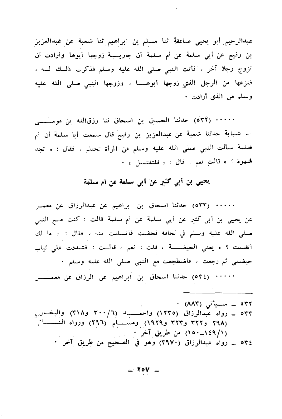 533 - حَدَّثَنَا إِسْحَاقُ بْنُ إِبْرَاهِيمَ، عَنْ عَبْدِ الرَّزَّاقِ، عَنْ مَعْمَرٍ، عَنْ يَحْيَى بْنِ أَبِي كَثِيرٍ، عَنْ أَبِي سَلَمَةَ، عَنْ أُمِّ سَلَمَةَ، قَالَتْ: كُنْتُ مَعَ النَّبِيِّ صَلَّى اللهُ عَلَيْهِ وَسَلَّمَ فِي لِحَافِهِ فَحِضْتُ فَانْسَلَلْتُ مِنْهُ فَقَالَ: «§مَالَكِ أَنُفِسْتِ؟» ، يَعْنِي الْحَيْضَةَ، قُلْتُ: نَعَمْ، قَالَتْ: فَشَدَدْتُ عَلَيَّ ثِيَابَ حَيْضَتِي، ثُمَّ رَجَعْتُ فَاضْطَجَعْتُ مَعَ النَّبِيِّ صَلَّى اللهُ عَلَيْهِ وَسَلَّمَ