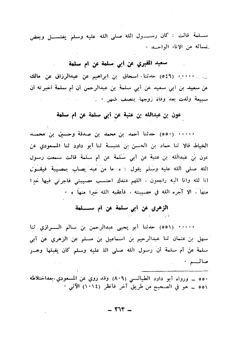550 - حَدَّثَنَا أَحْمَدُ بْنُ مُحَمَّدِ بْنِ صَدَقَةَ، وَحُسَيْنُ بْنُ مُحَمَّدٍ الْخَيَّاطُ، قَالَا: ثنا حَمَّادُ بْنُ الْحَسَنِ بْنِ عَنْبَسَةَ، ثنا أَبُو دَاوُدَ، ثنا الْمَسْعُودِيُّ، عَنْ عَوْنِ بْنِ عَبْدِ اللهِ بْنِ عُتْبَةَ، عَنْ أَبِي سَلَمَةَ، عَنْ أُمِّ سَلَمَةَ، قَالَتْ: سَمِعْتُ رَسُولَ اللهِ صَلَّى اللهُ عَلَيْهِ وَسَلَّمَ يَقُولُ: «§مَا مِنْ عَبْدٍ يُصَابُ بِمُصِيبَةٍ، فَيَقُولُ إِنَّا لِلَّهِ وَإِنَّا إِلَيْهِ رَاجِعُونَ، اللهُمَّ عِنْدَكَ أَحْتَسِبُ مُصِيبَتِي، فَأْجُرْنِي فِيهَا، وَاعْقُبْنِي مِنْهَا خَيْرًا، إِلَّا آجَرَهُ اللهُ فِي مُصِيبَتِهِ، فَأَعْقَبَهُ اللهُ خَيْرًا مِنْهَا»
