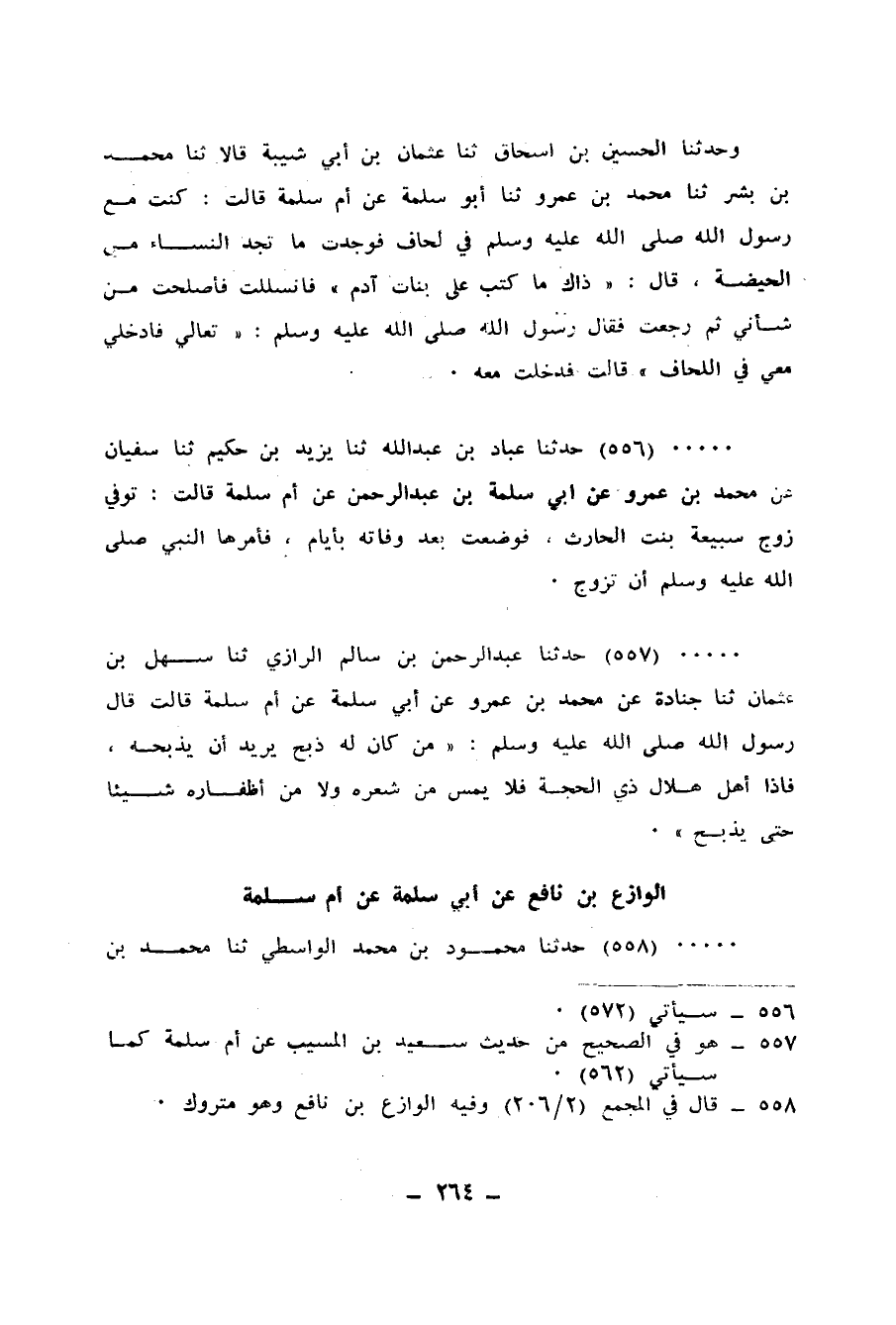 558 - حَدَّثَنَا مَحْمُودُ بْنُ مُحَمَّدٍ الْوَاسِطِيُّ، ثنا مُحَمَّدُ بْنُ الصَّبَّاحِ الْجَرْجَرَائِيُّ، ثنا عَلِيُّ بْنُ ثَابِتٍ، عَنِ الْوَازِعِ، عَنْ أَبِي سَلَمَةَ، عَنْ أُمِّ سَلَمَةَ، قَالَتْ: دَخَلَتْ عَلَيْنَا جَارِيَةٌ لِحَسَّانَ بْنِ ثَابِتٍ يَوْمَ فِطْرٍ نَاشِرَةً شَعْرَهَا، مَعَهَا دُفٌّ تُغْنِي، فَزَجَرَتْهَا أُمُّ سَلَمَةَ، فَقَالَ النَّبِيُّ صَلَّى اللهُ عَلَيْهِ وَسَلَّمَ: «دَعِيهَا يَا أُمَّ سَلَمَةَ فَإِنَّ §لِكُلِّ قَوْمٍ عِيدًا، وَهَذَا يَوْمُ عِيدِنَا»