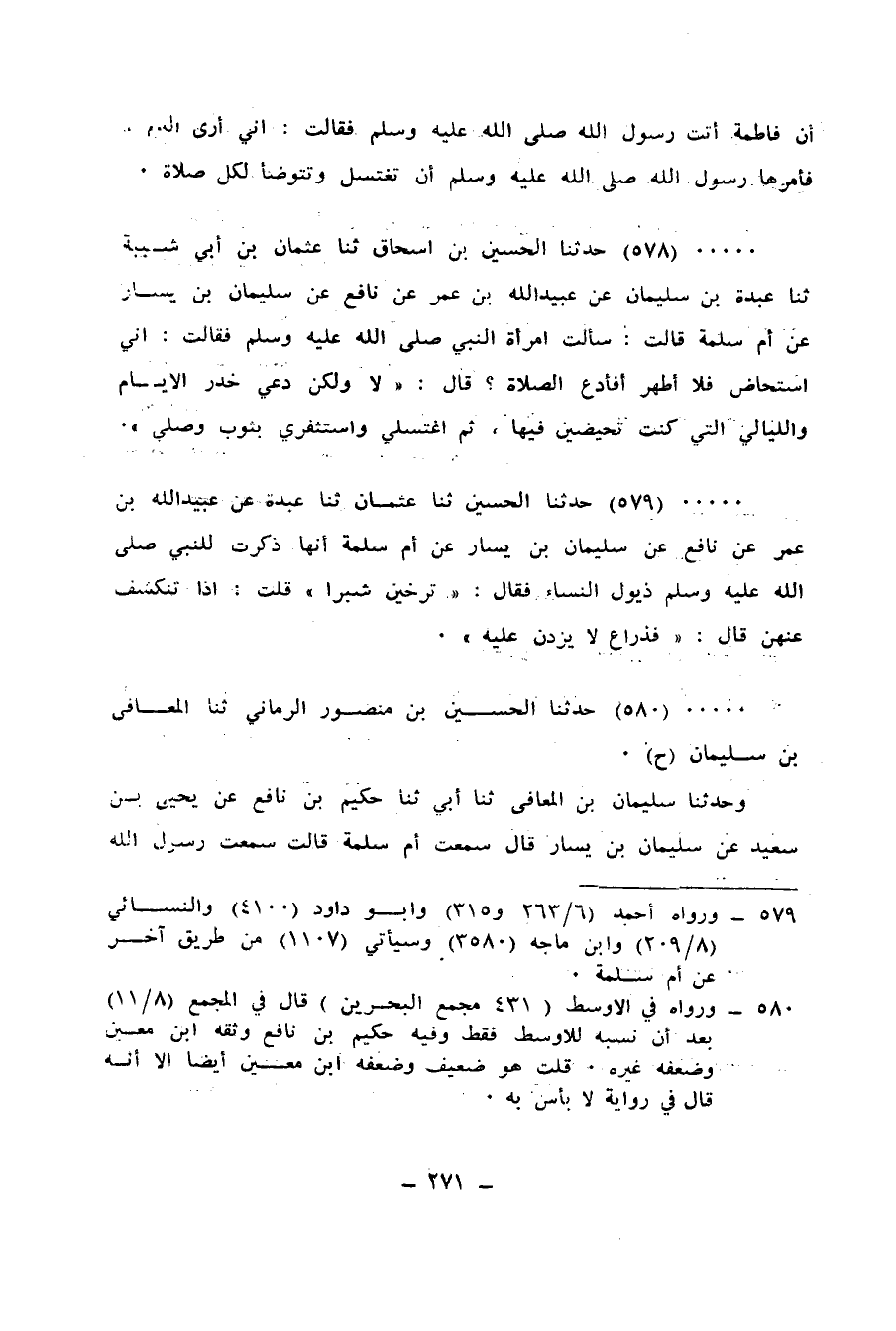 578 - حَدَّثَنَا الْحُسَيْنُ بْنُ إِسْحَاقَ، ثنا عُثْمَانُ بْنُ أَبِي شَيْبَةَ، ثنا عَبْدَةُ بْنُ سُلَيْمَانَ، عَنْ عُبَيْدِ اللهِ بْنِ عُمَرَ، عَنْ نَافِعٍ، عَنْ سُلَيْمَانَ بْنِ يَسَارٍ، عَنْ أُمِّ سَلَمَةَ، قَالَتْ: سَأَلَتِ امْرَأَةٌ النَّبِيَّ صَلَّى اللهُ عَلَيْهِ وَسَلَّمَ فَقَالَتْ: إِنِّي أُسْتَحَاضُ، فَلَا أَطْهُرُ، أَفَأَدَعُ الصَّلَاةَ؟، قَالَ: «لَا وَلَكِنْ §دَعِي قَدْرَ الْأَيَّامِ وَاللَّيَالِيَ الَّتِي كُنْتِ تَحِيضِينَ فِيهَا، ثُمَّ اغْتَسِلِي وَاسْتَثْفِرِي بِثَوْبٍ وَصَلِّي»