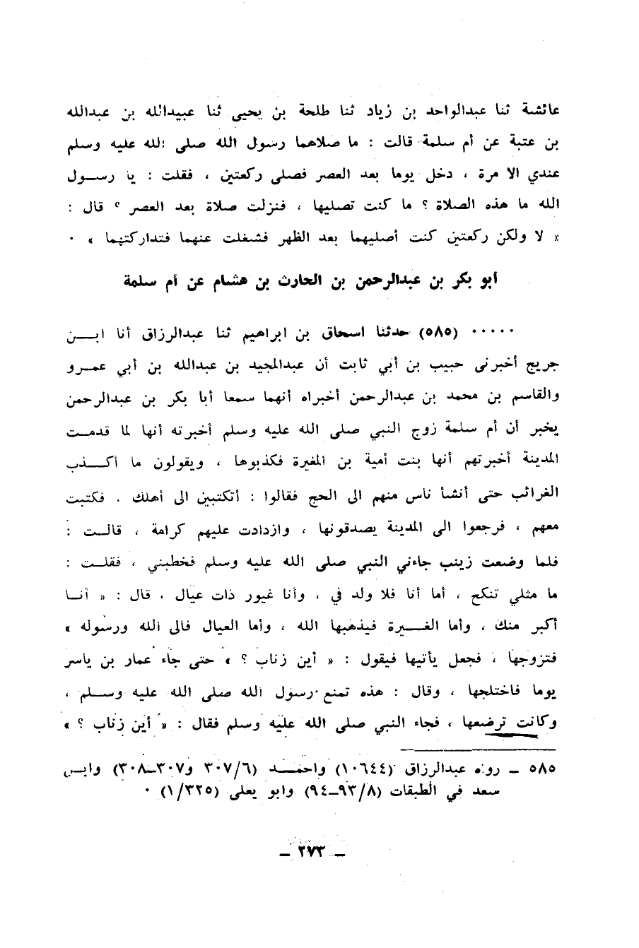 585 - حَدَّثَنَا إِسْحَاقُ بْنُ إِبْرَاهِيمَ، ثنا عَبْدُ الرَّزَّاقِ، أَنَا ابْنُ جُرَيْجٍ، أَخْبَرَنِي حَبِيبُ بْنُ أَبِي ثَابِتٍ، أَنَّ عَبْدَ الْمَجِيدِ بْنَ عَبْدِ اللهِ بْنِ أَبِي عَمْرٍو، وَالْقَاسِمُ بْنُ مُحَمَّدِ بْنِ عَبْدِ الرَّحْمَنِ، أَخْبَرَاهُ أَنَّهُمَا، سَمِعَا أَبَا بَكْرِ بْنَ عَبْدِ الرَّحْمَنِ، يُخْبِرُ، أَنَّ أُمَّ سَلَمَةَ، زَوْجَ النَّبِيِّ صَلَّى اللهُ عَلَيْهِ وَسَلَّمَ، أَخْبَرَتْهُ: أَنَّهَا لَمَّا قَدِمَتِ الْمَدِينَةَ، أَخْبَرَتْهُمْ أَنَّهَا بِنْتُ أُمَيَّةَ بْنِ الْمُغِيرَةِ فَكَذَّبُوهَا، وَيَقُولُونَ مَا أَكْذَبَ الْغَرَائِبِ حَتَّى أَنْشَأَ نَاسٌ مِنْهُمْ إِلَى الْحَجِّ، فَقَالُوا: أَتَكْتُبِينَ إِلَى أَهْلِكِ، فَكَتَبَتْ مَعَهُمْ، فَرَجَعُوا إِلَى الْمَدِينَةِ يُصَدِّقُونَهَا، وَازْدَادَتْ عَلَيْهِمْ كَرَامَةً، قَالَتْ: فَلَمَّا وَضَعَتْ زَيْنَبُ، جَاءَنِي النَّبِيُّ صَلَّى اللهُ عَلَيْهِ وَسَلَّمَ، فَخَطَبَنِي، فَقُلْتُ: مَا مِثْلِي تُنْكَحُ، أَمَّا أَنَا فَلَا وَلَدَ فِيَّ، وَأَنَا غَيُورٌ ذَاتُ عِيَالٍ، قَالَ: «§أَنَا أَكْبَرُ مِنْكِ، وَأَمَّا الْغَيْرَةُ فَيُذْهِبُهَا اللهُ، وَأَمَّا الْعِيَالُ فَإِلَى اللهِ وَرَسُولِهِ» فَتَزَوَّجَهَا، فَجَعَلَ يَأْتِيهَا فَيَقُولُ: «أَيْنَ زُنَابُ؟» ، حَتَّى جَاءَ عَمَّارُ بْنُ يَاسِرٍ يَوْمًا فَاخْتَلَجَهَا، وَقَالَ: هَذِهِ تَمْنَعُ رَسُولَ اللهِ صَلَّى اللهُ عَلَيْهِ وَسَلَّمَ، وَكَانَتْ تُرْضِعُهَا، فَجَاءَ النَّبِيُّ صَلَّى اللهُ عَلَيْهِ وَسَلَّمَ، فَقَالَ: «أَيْنَ زُنَابُ؟» ، قَالَتْ: قُرَيْبَةُ بِنْتُ أُمَيَّةَ، وَوَافَقَهَا عِنْدَهَا، أَخَذَهَا عَمَّارُ بْنُ يَاسِرٍ، فَقَالَ النَّبِيُّ صَلَّى اللهُ عَلَيْهِ وَسَلَّمَ: «أَنَا آتِيكُمُ اللَّيْلَةَ» ، قَالَتْ: فَقُمْتُ، فَوَضَعْتُ ثِفَالِي، وَأَخَّرْتُ حَبَّاتٍ مِنْ شَعِيرٍ كَانَتْ فِي جَرٍّ، وَأَخْرَجْتُ شَحْمًا، فَعَصَدْتُهُ لَهُ، قَالَتْ: فَبَاتَ النَّبِيُّ صَلَّى اللهُ عَلَيْهِ وَسَلَّمَ، ثُمَّ أَصْبَحَ، فَقَالَ حِينَ أَصْبَحَ: «إِنَّ بِكِ عَلَى أَهْلِكِ كَرَامَةً، فَإِنْ شِئْتِ سَبَّعْتُ، وَإِنْ أُسَبِّعْ أُسَبِّعْ لِنِسَائِي»