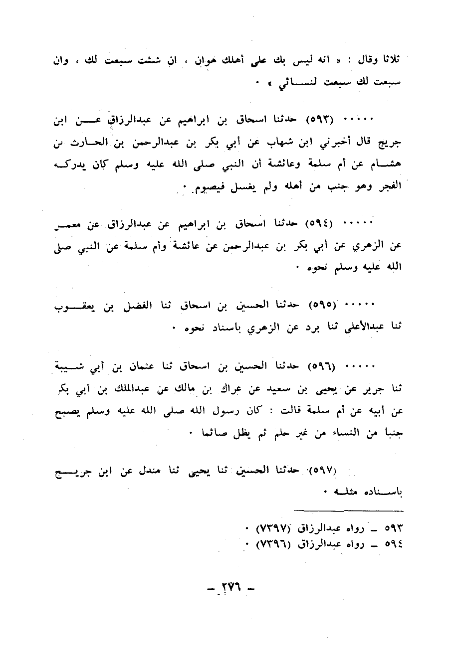 593 - حَدَّثَنَا إِسْحَاقُ بْنُ إِبْرَاهِيمَ، عَنْ عَبْدِ الرَّزَّاقِ، عَنِ ابْنِ جُرَيْجٍ، قَالَ: أَخْبَرَنِي ابْنُ شِهَابٍ، عَنْ أَبِي بَكْرِ بْنِ عَبْدِ الرَّحْمَنِ بْنِ الْحَارِثِ بْنِ هِشَامٍ، عَنْ أُمِّ سَلَمَةَ، وَعَائِشَةَ، أَنَّ النَّبِيَّ صَلَّى اللهُ عَلَيْهِ وَسَلَّمَ كَانَ: «§يُدْرِكُهُ الْفَجْرُ وَهُوَ جُنُبٌ مِنْ أَهْلِهِ، وَلَمْ يَغْتَسِلْ فَيَصُومُ» .
